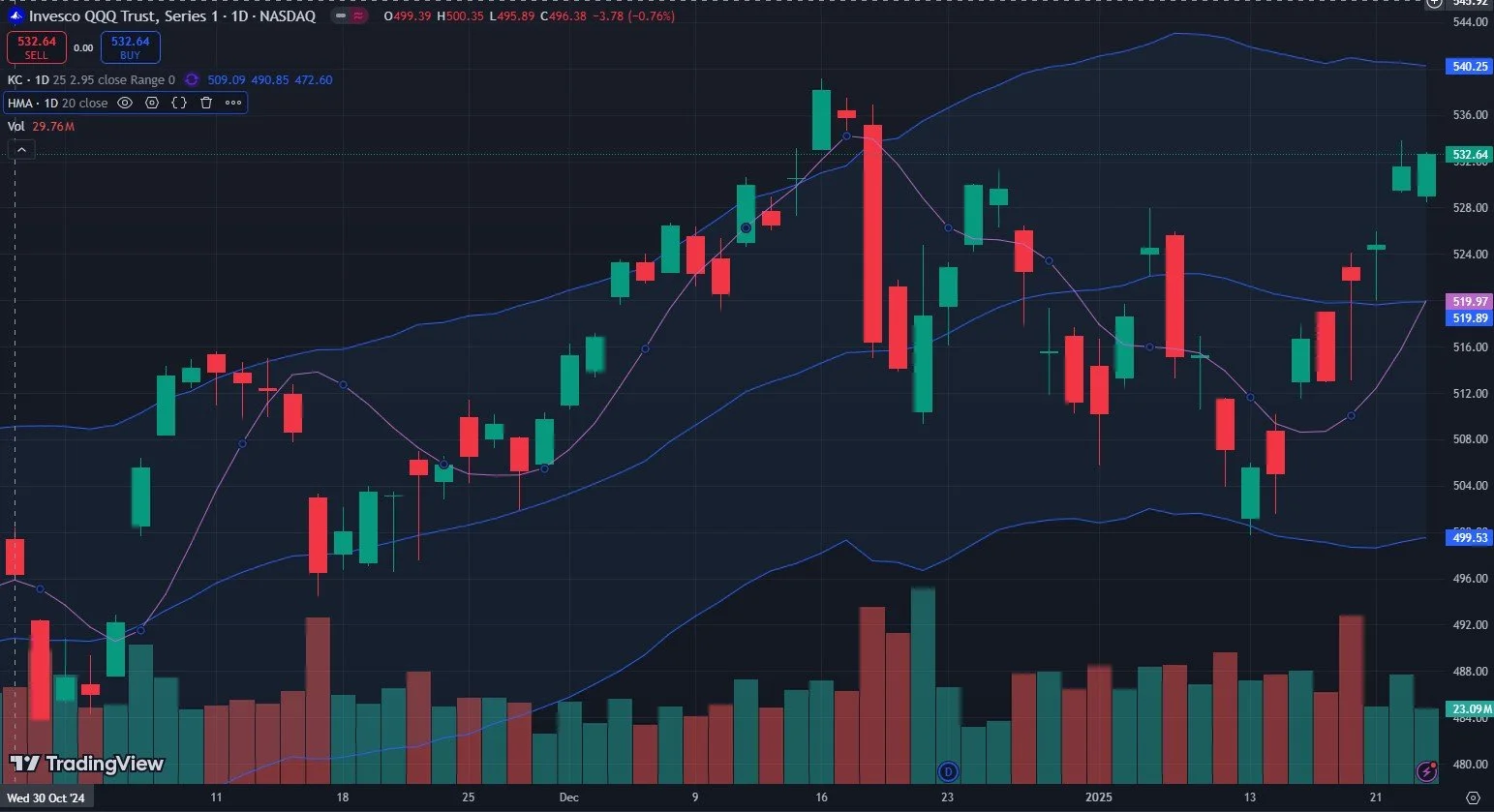 The market is currently reminding me a lot of the situation we saw in December, where SPX ended up topping before QQQ, and QQQ was the last to move higher. QQQ was also the last to make a low recently. A quick glance at the Keltner channels shows SPX to already be up against the upper daily Keltner channel, while QQQ has some room to go to reach that same spot.