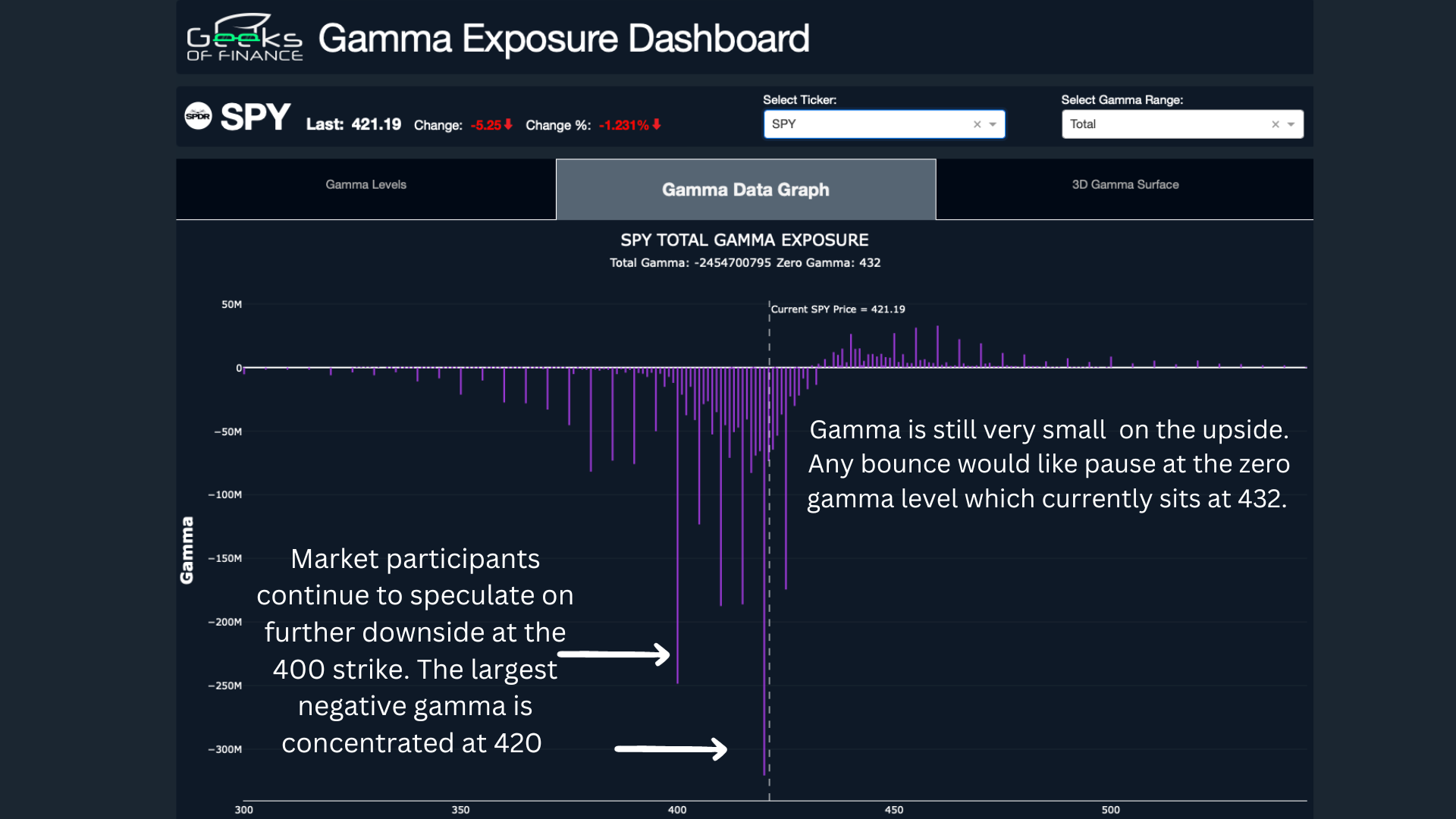 The VIX solidly broke above its zero gamma range last week and is fast approaching our target in the 25-28 zone. On the SPY, gamma is heavily concentrated around the 420 strike, so a confirmed break below that level and we could quickly see the 400 strike come in to play as gamma continues to grow there. SPX is not quite as bearish yet, with the 4200 and 4100 strikes the primary levels we’re watching this week.