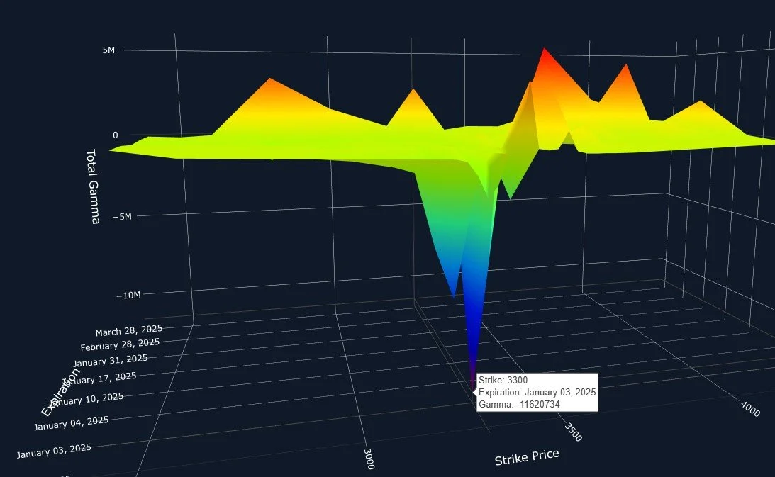 While ETH show overall positive GEX, which we consider to be a positive for bulls, Friday’s expiry shows the largest GEX cluster to be a negative cluster at 3300. The next largest cluster is negative too, at 3250. Going along with what I said about the market this week, I am open to the possibility that we drop further this week, but begin a nice move up next week or beyond as we approach January OpEx.