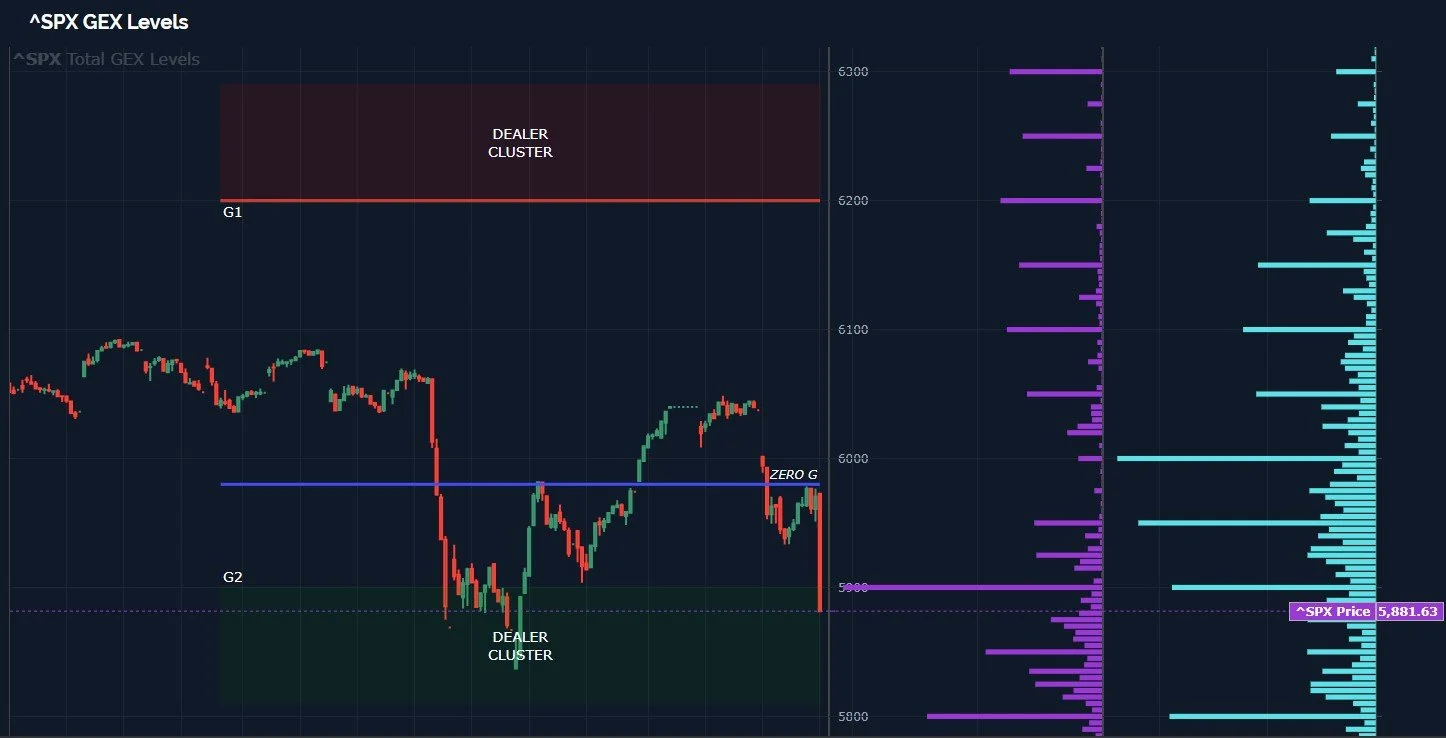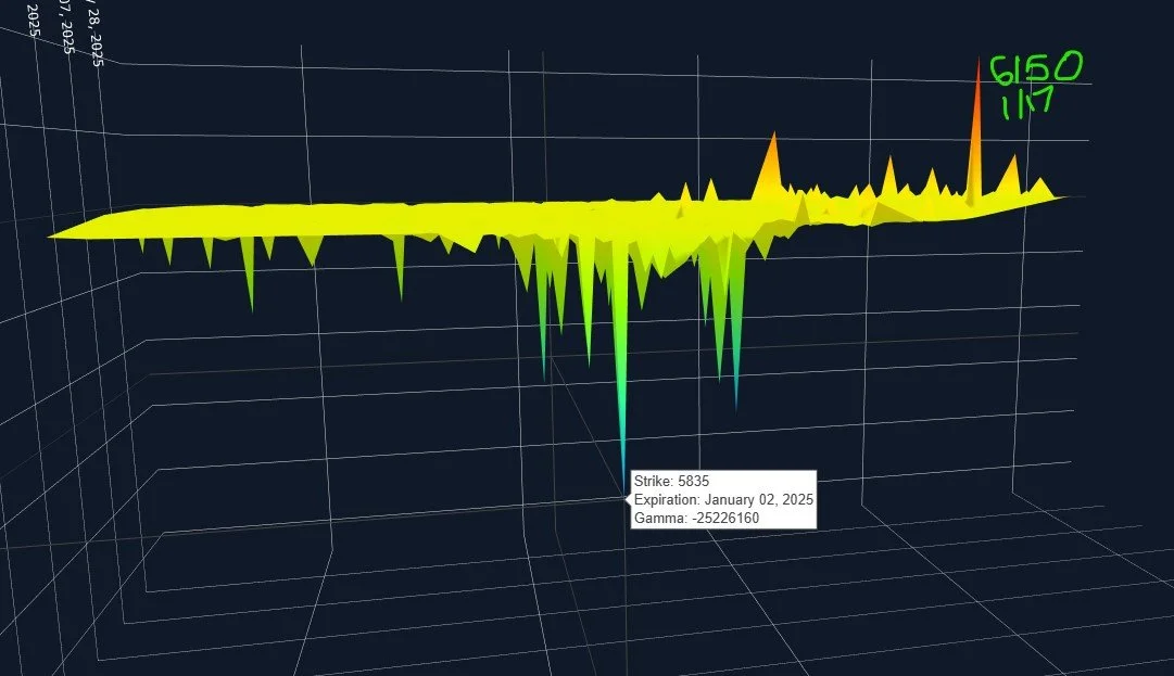 Tomorrow’s largest GEX cluster that is expiring is at 5835, interestingly, but we do see a sizable positive cluster at 6150 looking out to January 17. This GEX picture can change tomorrow, and it likely will to some extent, but looking at the picture below, as of this moment I would place decent odds on a continued struggle to gain positive momentum for this week, then at some point we begin a fairly nice rally into that January 17 expiry. With negative GEX and near-term lower clusters, we need to see a few things shift to make that a reality. This also includes technically regaining the Hull at 5936, which may move lower in coming days, so we’ll update our analysis along the way.