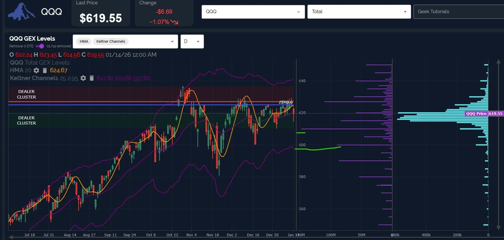 QQQ also saw net GEX decrease, dropping into negative territory.