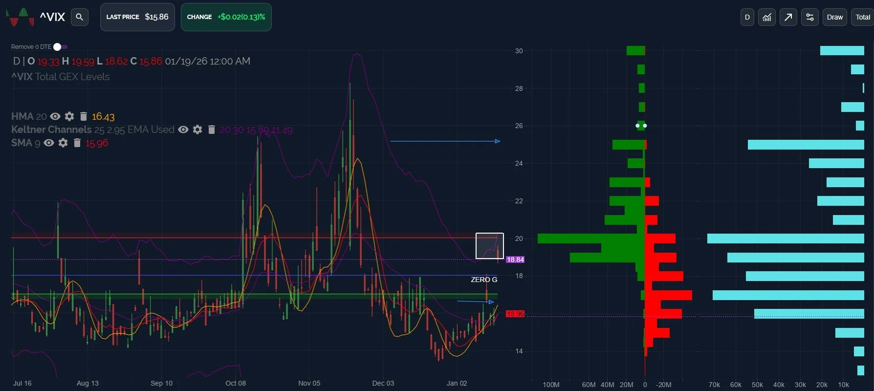 The first lower test for the bullish volatility picture may be at the rising Hull Moving Average, currently at 16.43. A daily close below the Hull may signal a return toward the 14-15 zone, so we’ll watch action early this week and any accompanying clues from shifts in GEX.