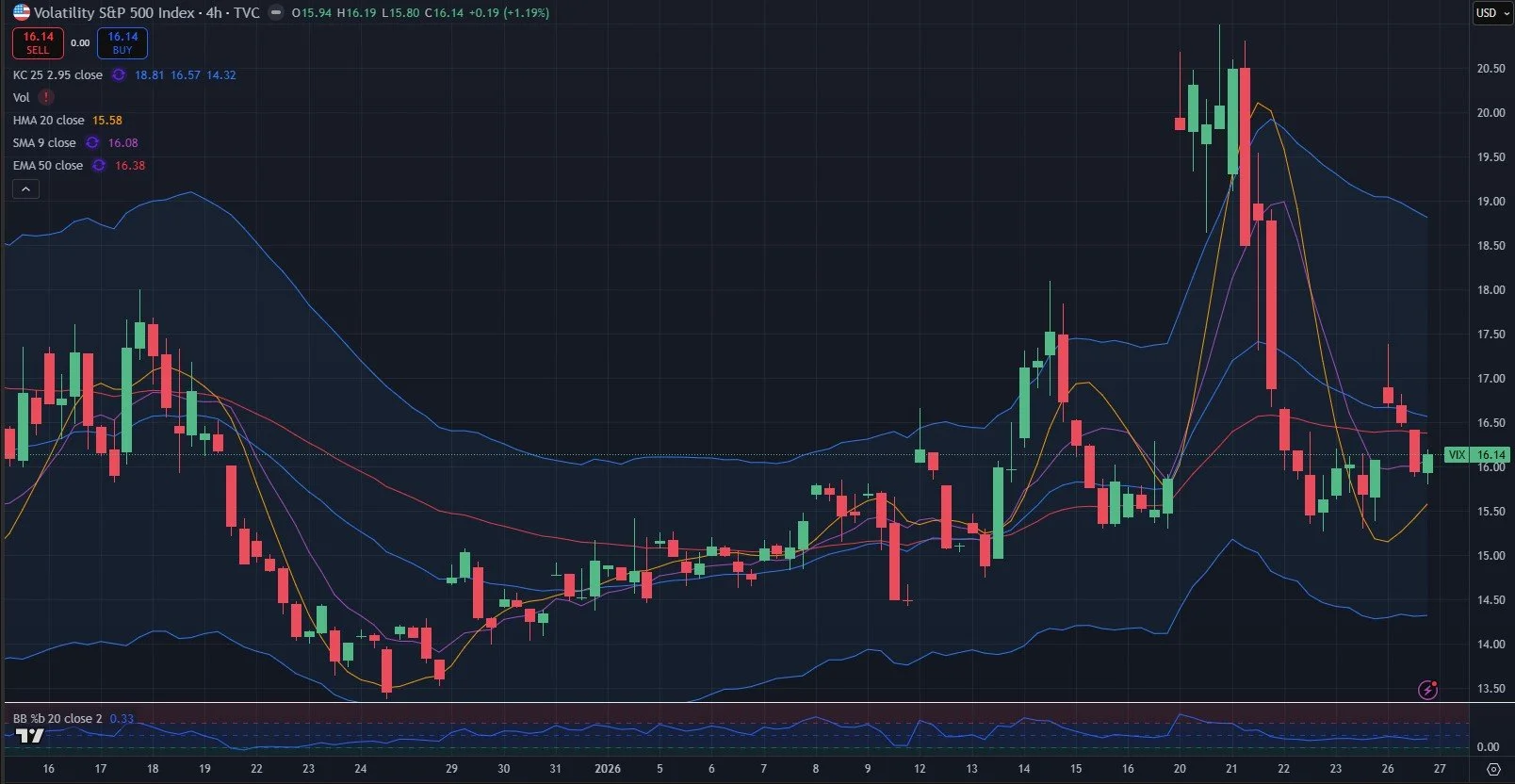 Even if we see a spike toward the 18-19 zone, the VIX is below key daily resistance and the weekly Hull is still declining, so a magnetic pull back toward 14 may ultimately happen.