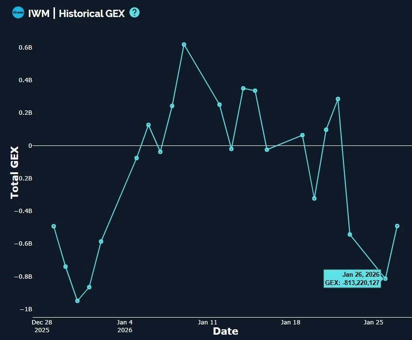 IWM has been on a GEX downtrend since mid-January, though we saw an uptick today, so shifts in GEX in conjunction with price action will be interesting to watch for the rest of the week.