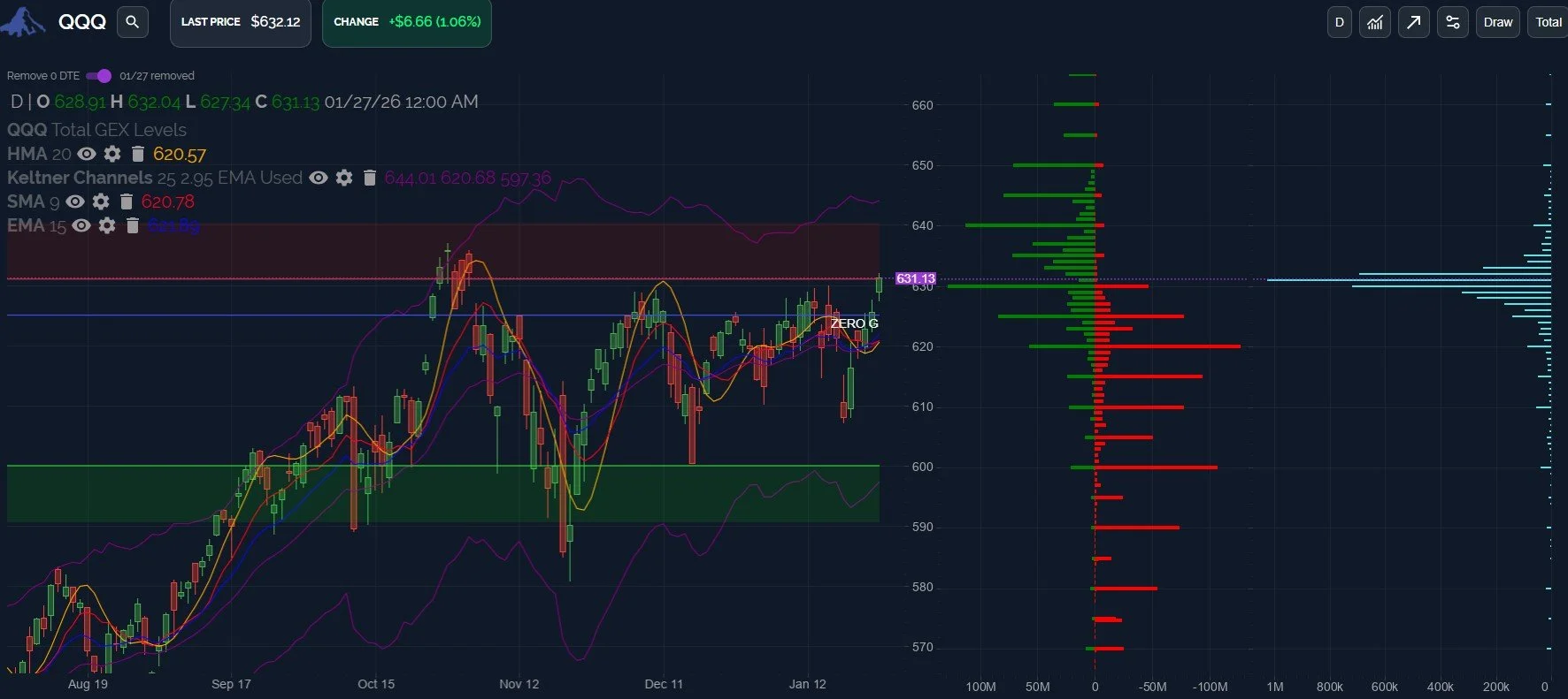 640 is also just below the upper Keltner channel, so the confluence of the large GEX cluster at that spot as we head into the FOMC announcement and the eve of several major tech reports could certainly serve as catalysts for a move toward 640.
