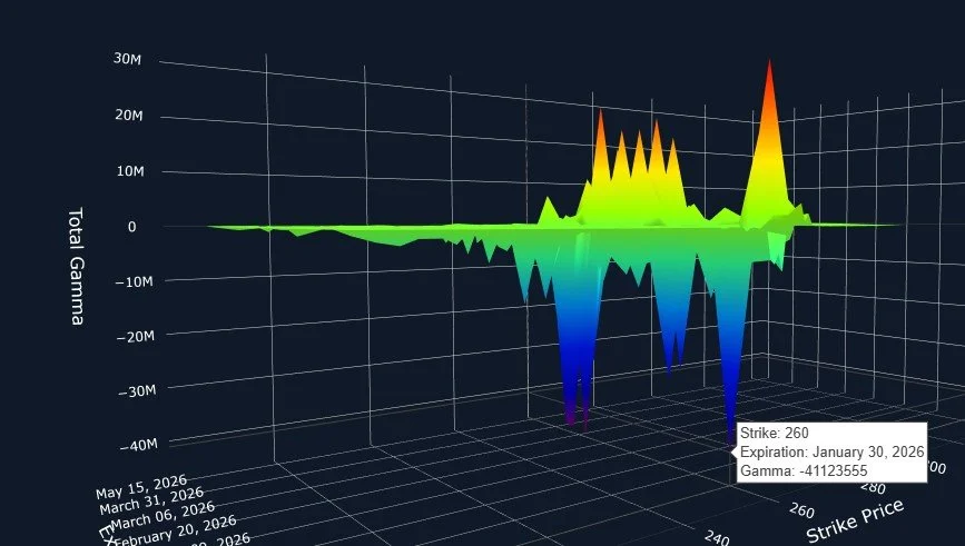 One thing that caught my eye on our 3D graph is the largest GEX cluster at any one strike for Friday is the negative cluster at 260. The largest positive cluster is at 270, though somewhat smaller in size.