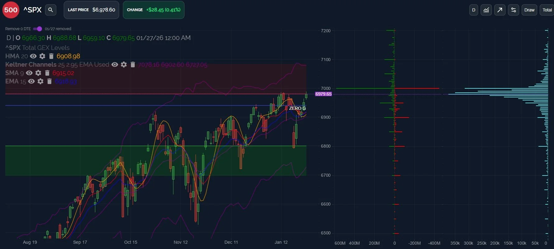 The large GEX at 7000 implies a potential temporary ceiling at that level, with a reasonable assumption that SPX might encounter consolidation at that zone, even if it takes a few days.