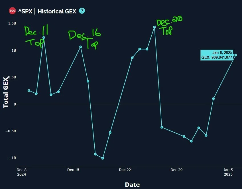 The GEX Levels chart shows below shows an impressive upper Dealer Cluster zone from 6200-6300, which has moved up from anything we saw in 2024, and our lower zone ranges from 5800-5900. This GEX structure certainly seems to be an improvement from days past, and adds to the general notion that dips may prove to be buying opportunities.