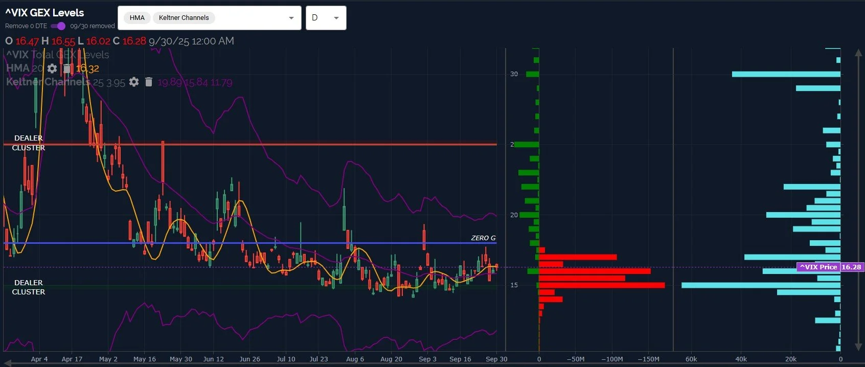 The VIX daily chart technically closed below the Hull, though barely, and we have a general pattern of higher lows and higher highs. The thick wall of negative GEX down to 15 likely represents support, implying that downside for the VIX is limited from here, with upside potential to 20-25 based on GEX and option volume.