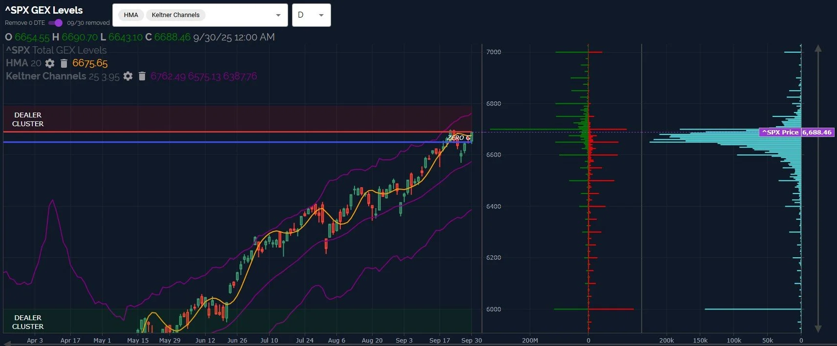 While the upper Keltner channel is continuing to barrel toward 6800, the large GEX cluster at 6700 (and the dropping off of GEX clusters at higher strikes) represents a formidable barrier to an immediate continuation higher, especially beyond the 6750-6800 area, possibly capping upside to 1-1.5% higher from here before another pullback.