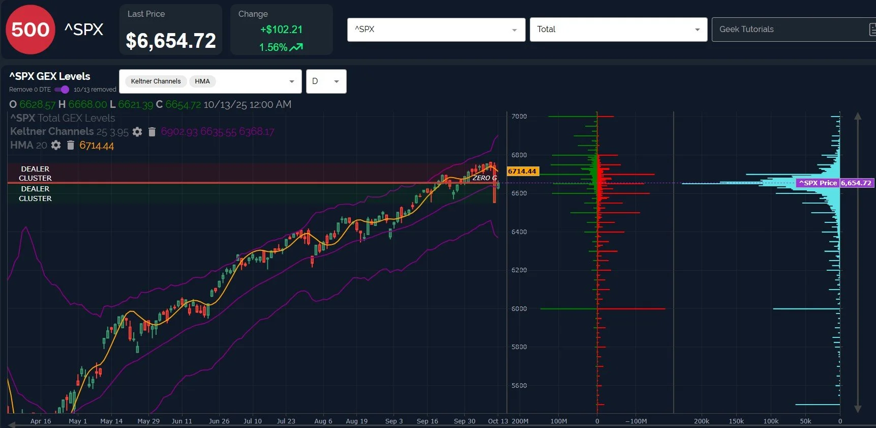 Regardless of whether the drop is over or not, it would seem only proper to have SPX at least attempt to overcome the now declining Hull at 6714.44. 6700 is a huge GEX zone on the positive and negative side, so a breach above 6700 that holds likely means we continue higher, while rejection potentially implies a retest of Friday’s lows or even lower.