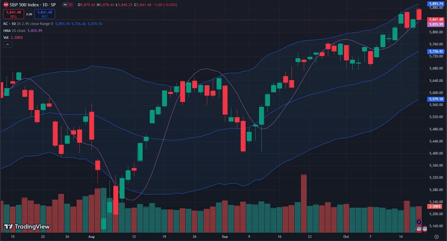 Let’s jump right into SPX: We continue to hold the Hull Moving Average, which helps to keep alive the seemingly permanent bullish trend. That said, the last few days haven’t been easy, which is somewhat typical of OpEx (despite the bullish bias). Take today for instance: A big gap up, then a sell off back to yesterday’s highs. The Keltner channels continue rising, with SPX almost reaching the 5900 we see on the GEX charts. This confluence is certainly a mark in favor of 5900 very soon, in my opinion.