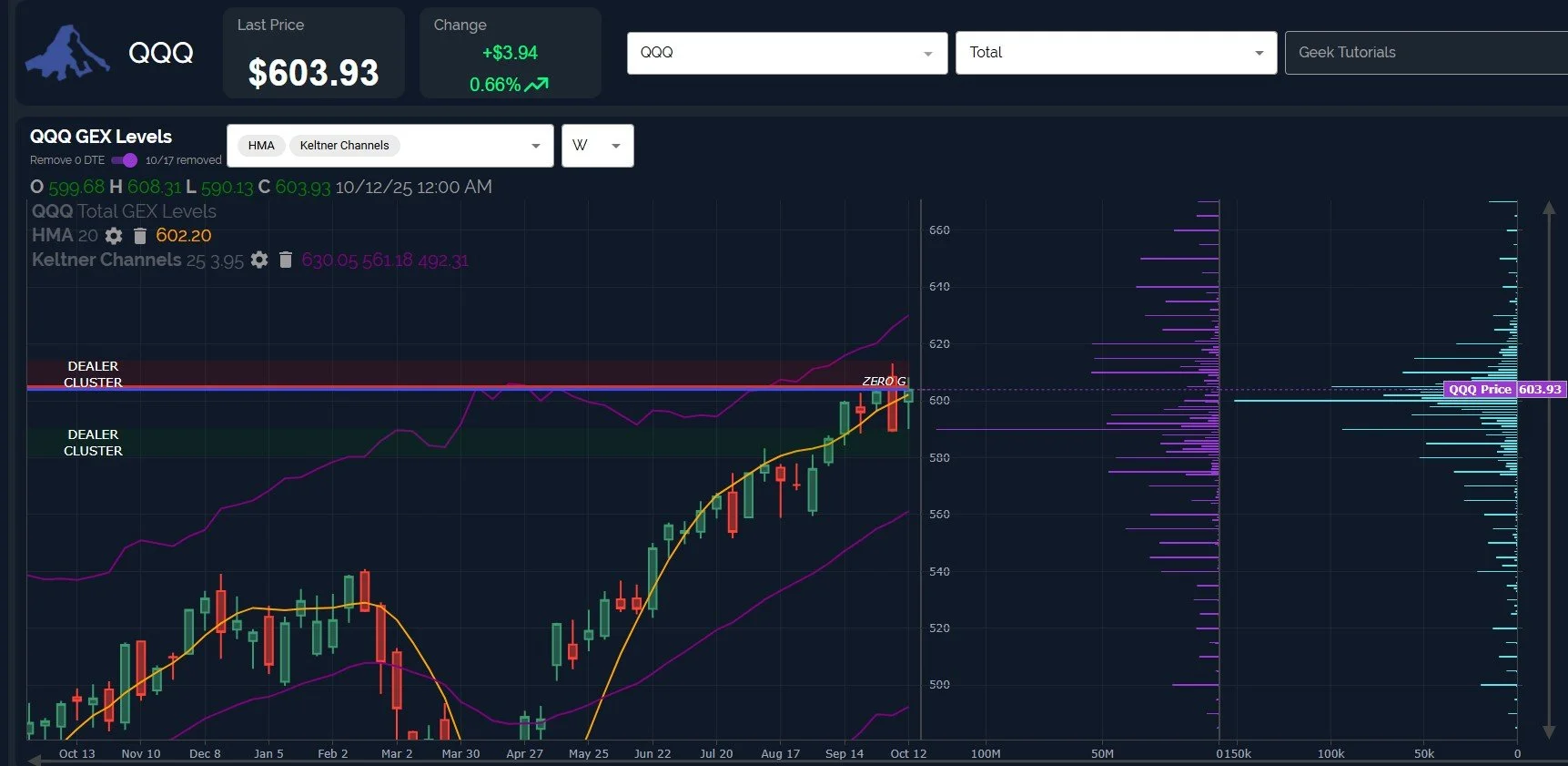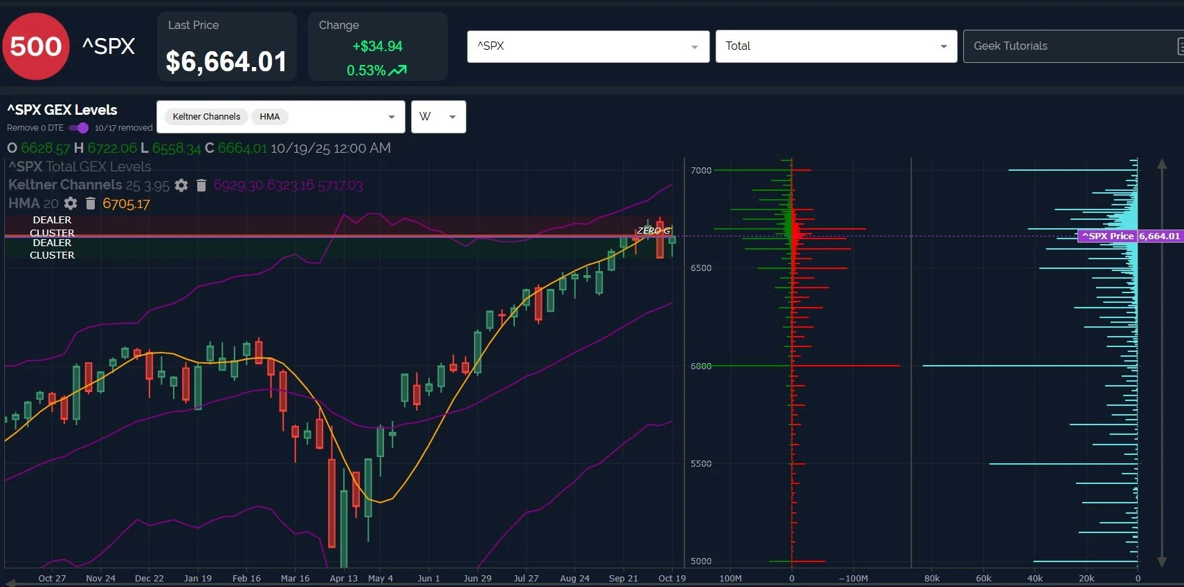 SPX’s weekly chart, which has gross GEX toggled, shows a close below the weekly Hull for the 2nd week in a row.