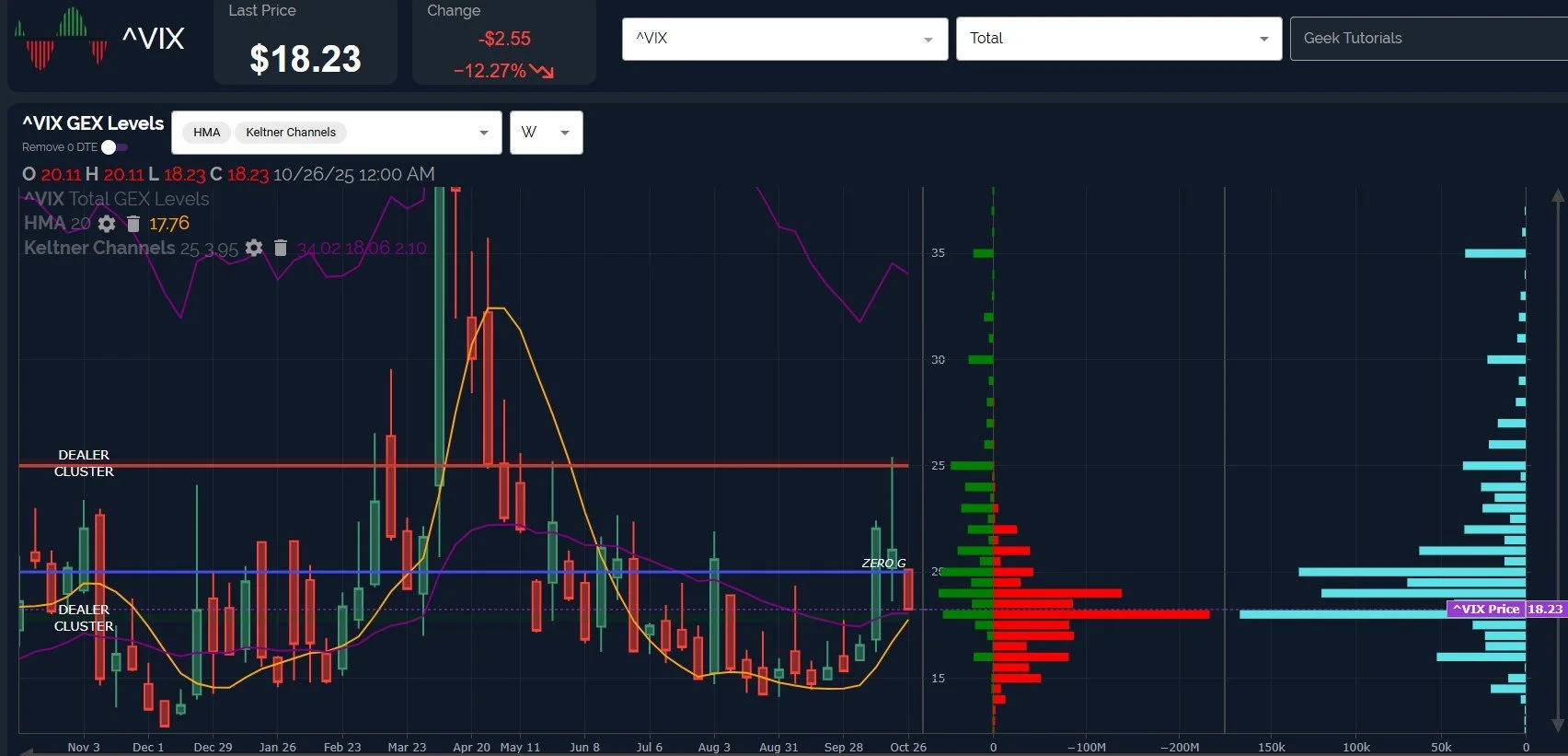 The weekly VIX chart shows the VIX already near the big GEX cluster at the 18 strike, also close to the rising weekly Hull Moving Average.