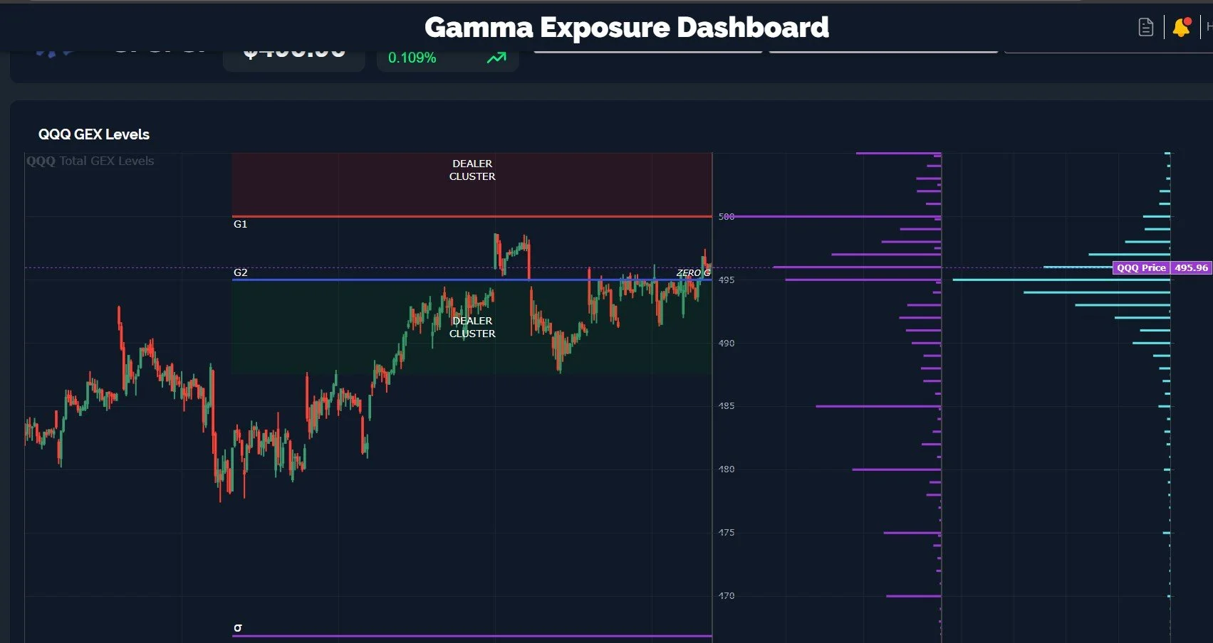 Our GEX Levels chart below shows QQQ 500 remains as a sizable target and the lower edge of the G1 Dealer Cluster Zone, where we expect potential for reversal back down.