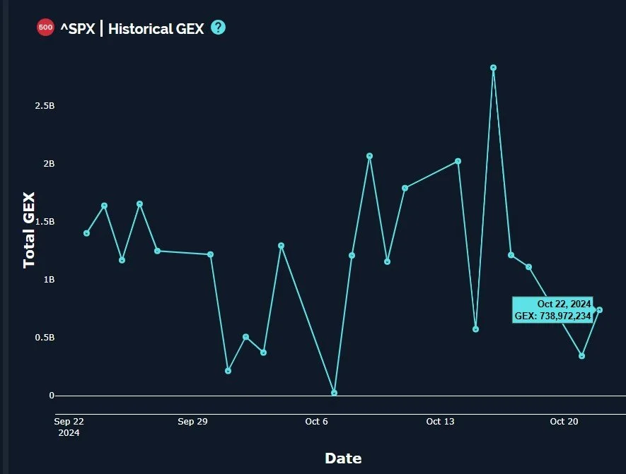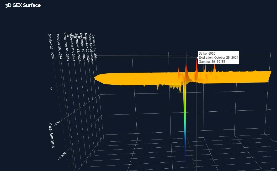 Looking at our 3D chart, we still see 5900 as a sizable GEX cluster concentrated on Friday 10/25. GEX totals would have been even more positive excluding the 160M of negative GEX at 5850 (the big downward spike you see). That cluster will disappear tomorrow morning as it expired today. As far as these charts go, for your information, we run a nightly GEX update, and then starting at 8 AM ET, we run updates every 30 seconds.