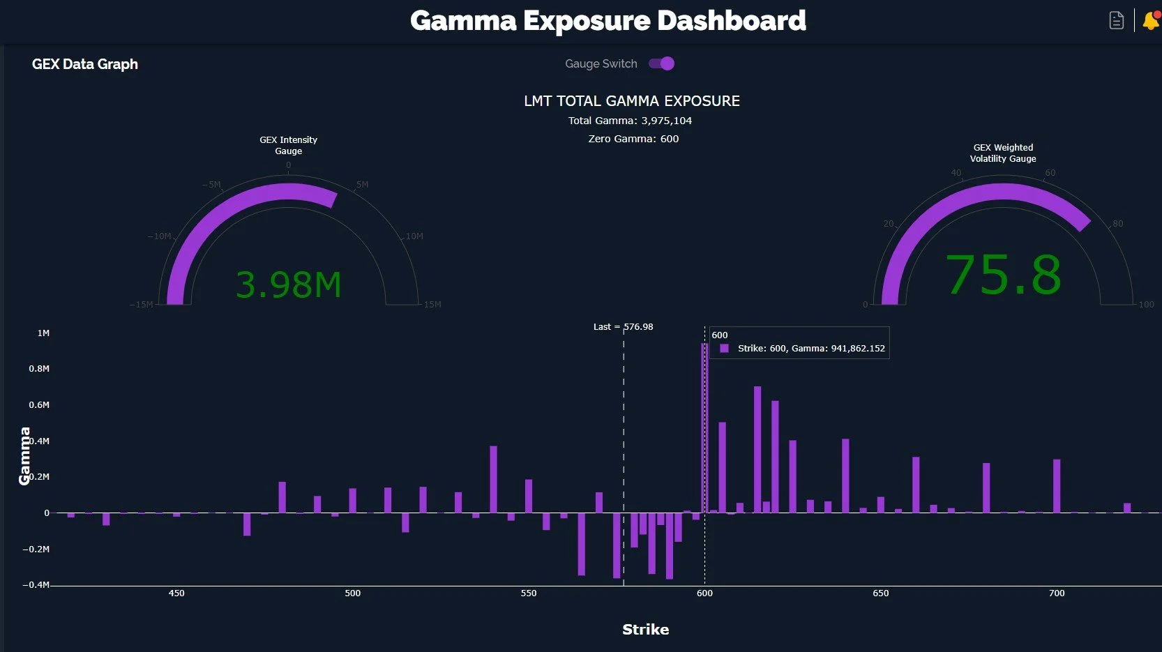 One of several ideas we cover in our YouTube video is LMT, a big defense sector play that dropped considerably today. We are only a few dollars away from the big negative clusters at 565 and 575, but with positive GEX overall and a large positive cluster at 600, we wouldn’t be shocked to see a sizable bounce from 565 or so up to 600, which also represents the zero GEX level.
