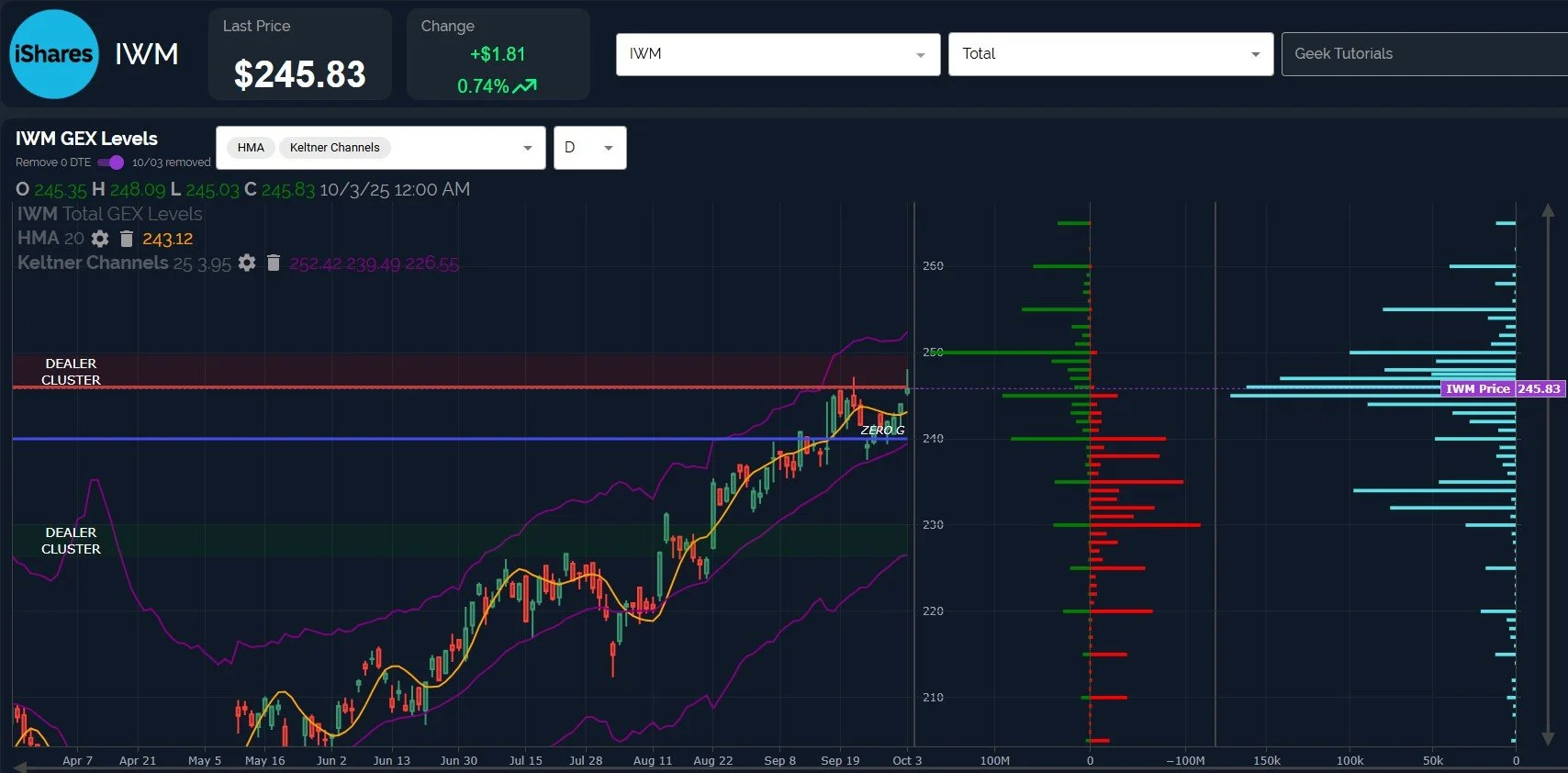IWM remains in slightly positive net GEX, a reading we consider neutral.