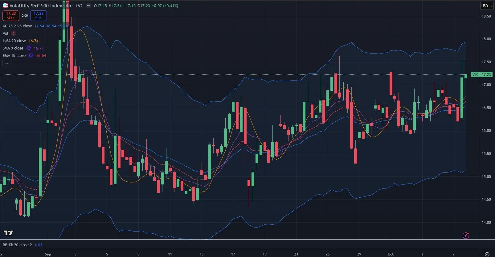 VIX 4-hour chart maintains the volatility uptrend, with the VIX regaining the key Hull Moving Average, and the Keltners allow room up to 18, not too far from today’s 17.23 close.
