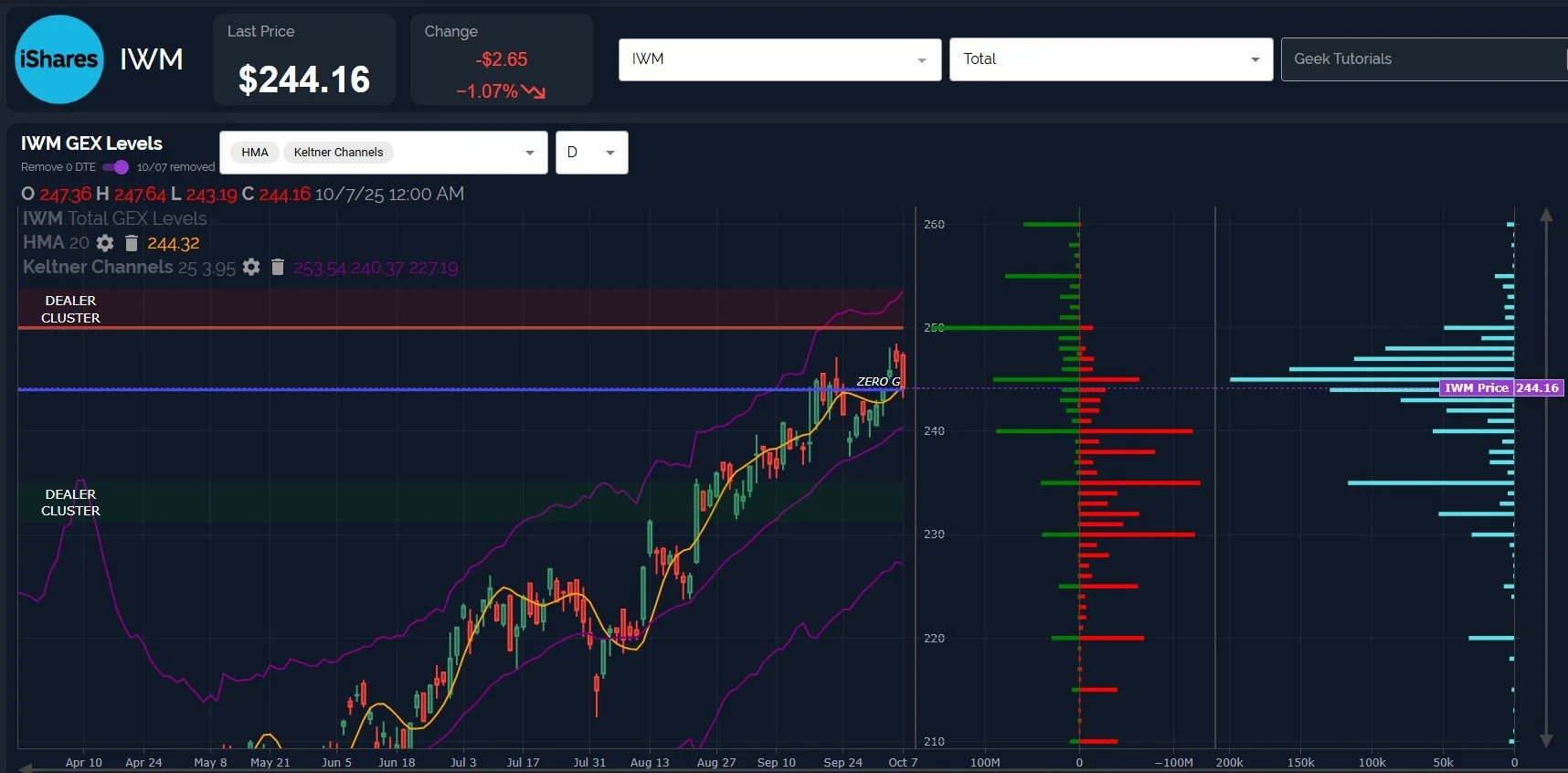 600 becomes an important line of delineation. Negative GEX at 580 and 590 is significant and may represent initial downside targets once a “real” pullback unfolds. 580 will soon mark the lower Keltner channel on the daily chart, making for nice confluence of GEX+chart indicators at 580.