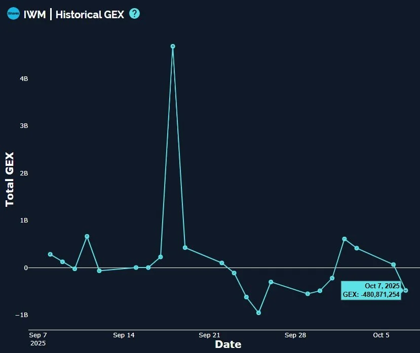 IWM saw a move into negative GEX territory today, similar to QQQ. Not exactly what a feverishly bullish cheerleader would want to see, and this is 3 days in a row of negative movement for IWM GEX.