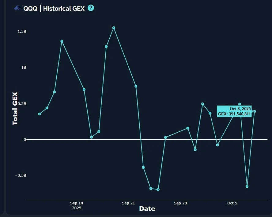 QQQ exceeded the big 610 GEX cluster after two days of falling just short of the mark, bringing the next levels at 615 and 620 into focus.