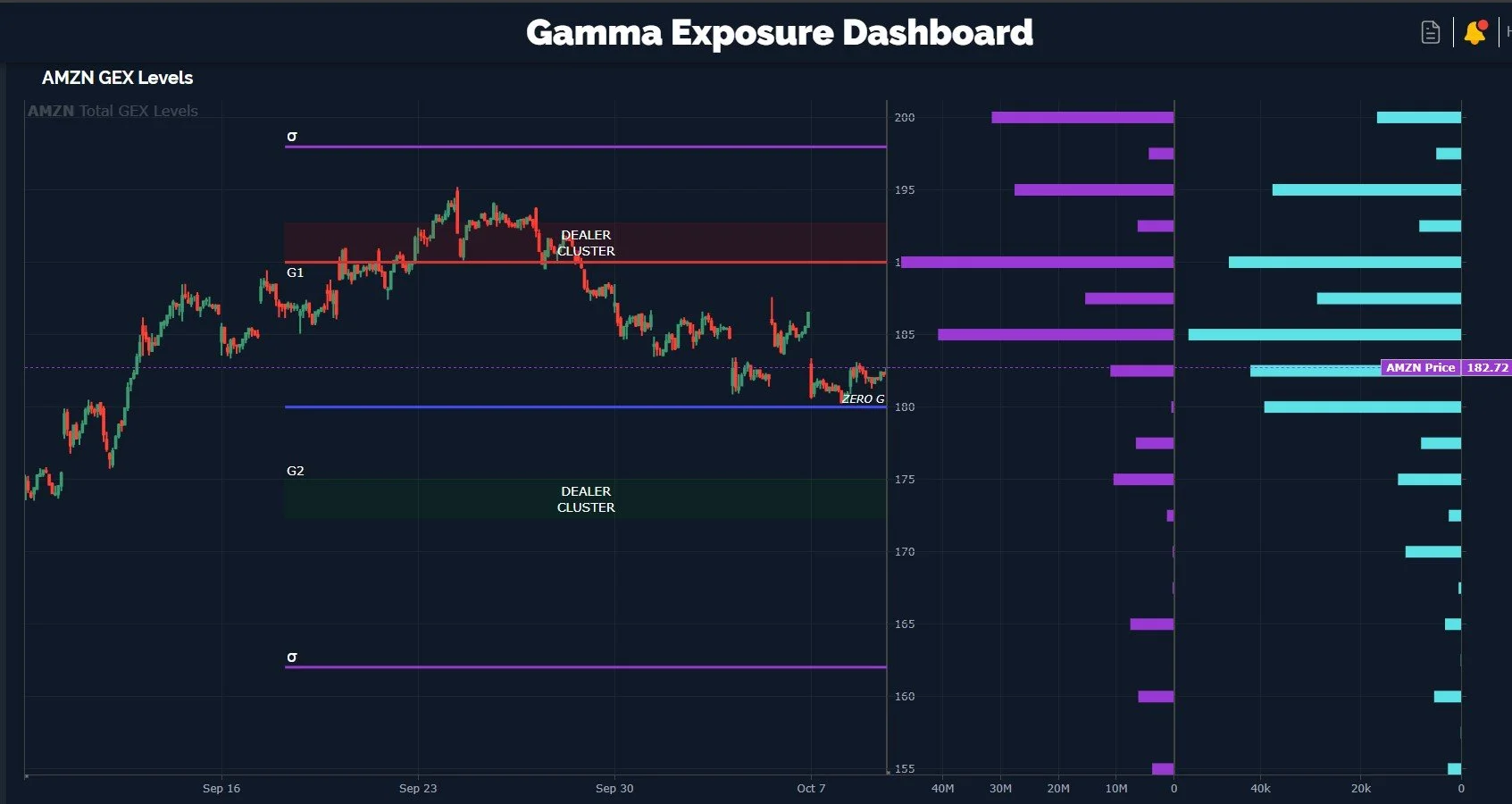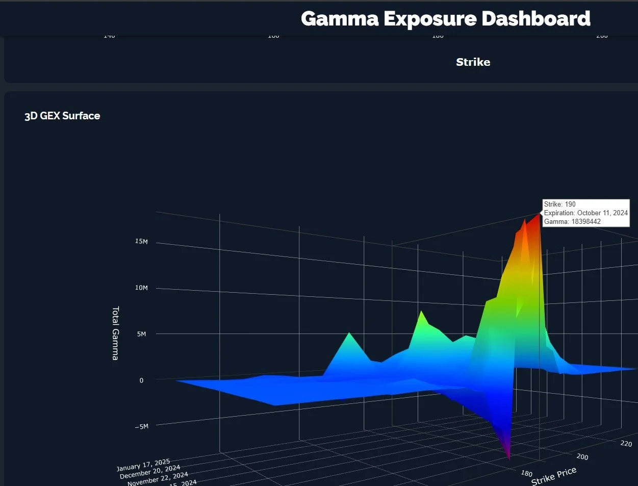 Looking at the 3D chart below, we see considerable GEX on AMZN at 190 expiring Friday the 11th. On the flip side, we do see negative GEX at 180 also expiring Friday, but we’re already close to the lower end of those large clusters. Which cluster remains to be hit?