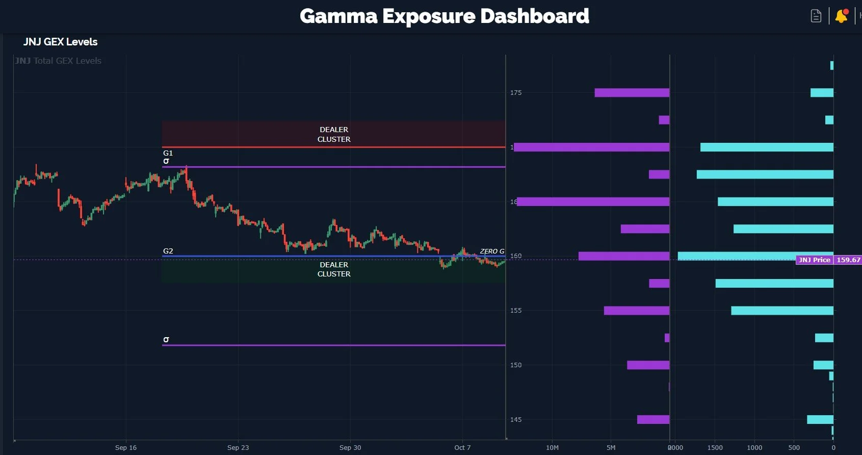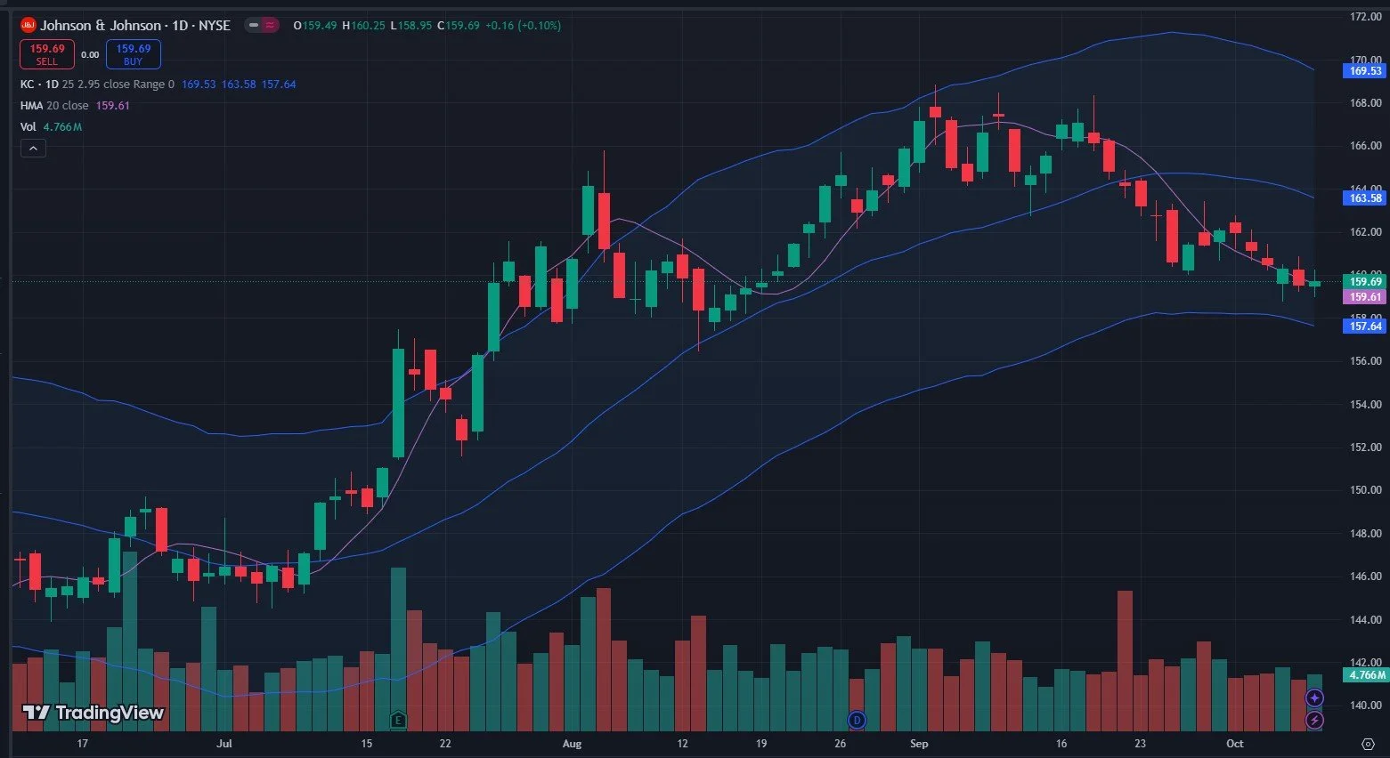 Johnson & Johnson (JNJ) closed 0.08 above the Hull, a good sign, and it’s near the bottom of the daily Keltner channel. 170 seems to be strongly indicated by GEX levels, and this is the 2nd day out of the last 3 where JNJ closed above the Hull. Seems like an attempt higher might happen soon, from the looks of it.