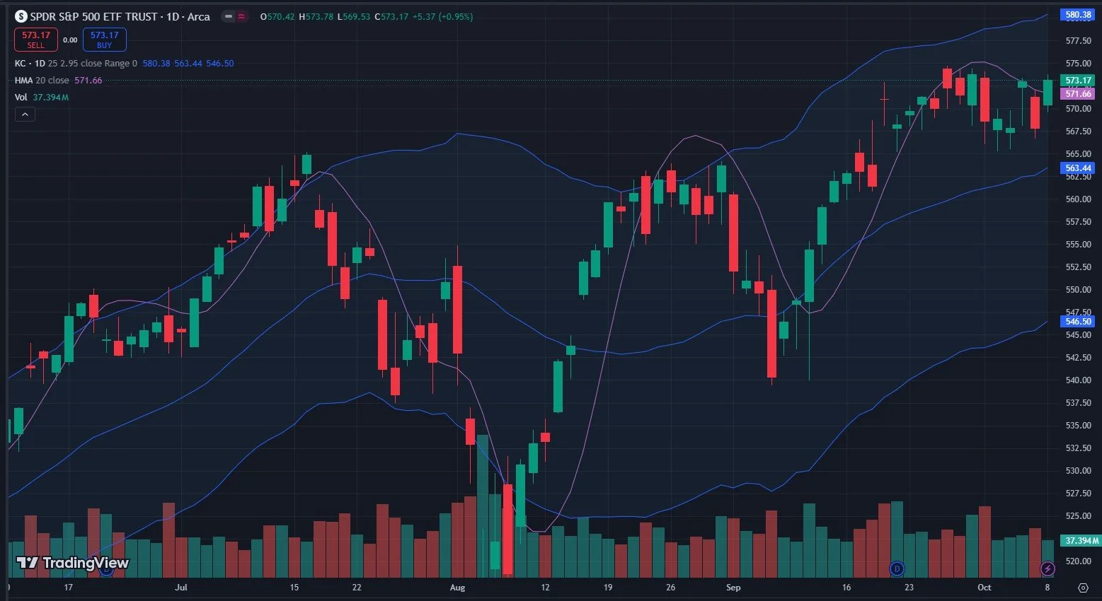 Yesterday we said “to reach that 580 [SPY] target, we need to hold above the declining Hull line at 572, and 560-562 sits below as an important pivot as well. The Keltner channels are still in an uptrend, though not a steep one.”