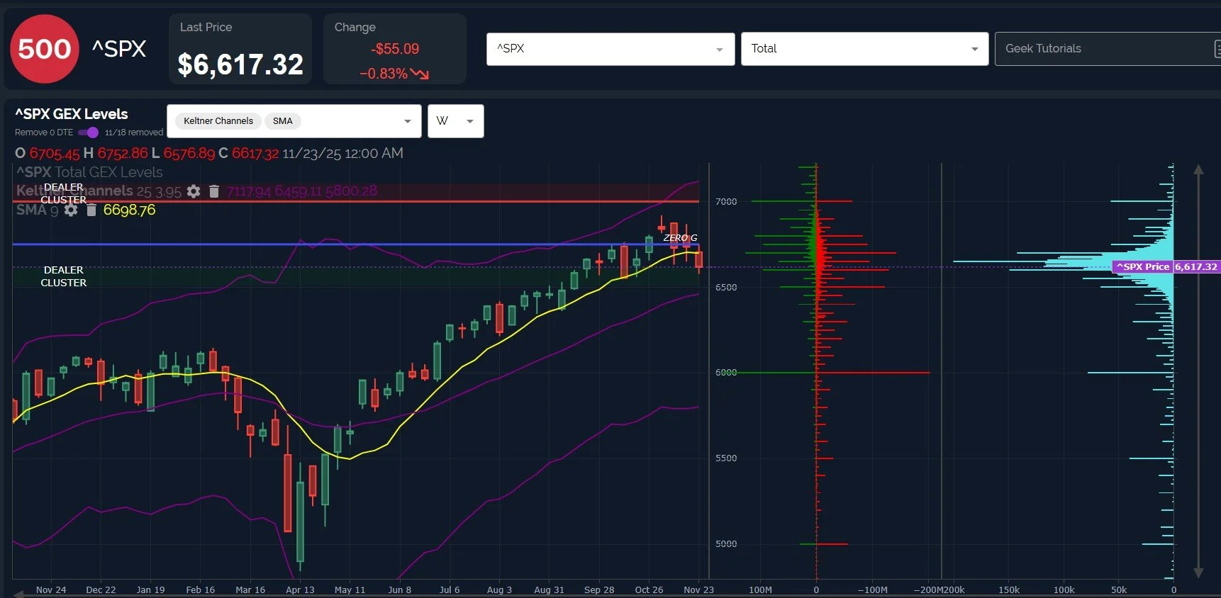 The weekly chart shows the middle Keltner at 6450, the big GEX cluster at 6500, and large GEX at 6000 that has been at that strike for awhile. 6000 only comes into play if we decisively lose 6500, in my opinion.