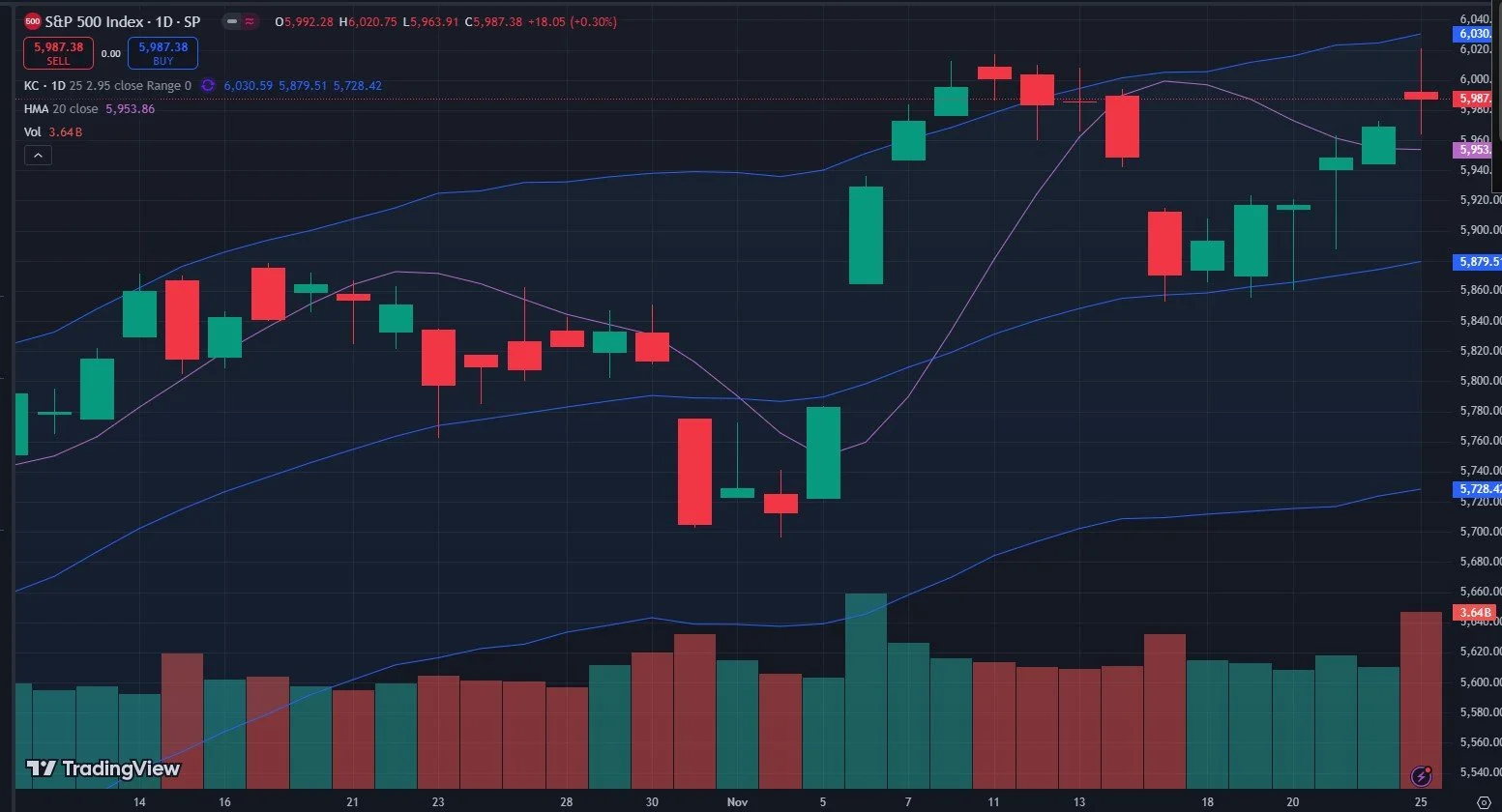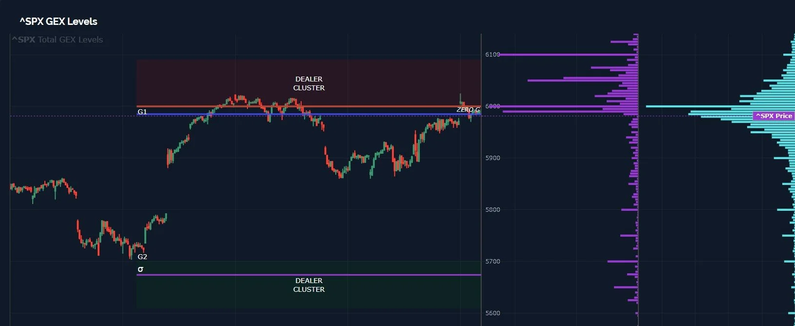 Last Thursday, we mentioned that the VIX was showing signs of a potential 14.50 retest, which presumably would coincide with SPX hitting 6000. We saw a little bait-and-switch with the gamma (GEX) picture Friday morning, with the 6000 GEX shifting to today (Monday, November 25), though at least we were given the heads up intraday before the weekend. Today was vindicating in that we saw both VIX 14.50 (14.54 actually) touched and SPX surpassed 6000 to test the upper Keltner around 6021 before dropping sharply, sending the VIX higher.