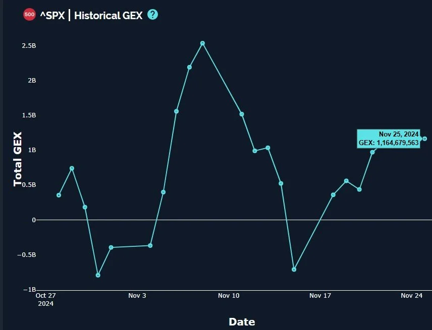 SPX GEX continues to reflect bullish positioning, and while I didn’t share it today, our 3D graph shows 6055 and 6100 as prominent GEX clusters for December 20 and December 31. That’s a few weeks away (where did this year go?), leaving enough time for a VIX spike and then the final push into year end, assuming the current GEX positioning remains the same (it might not).