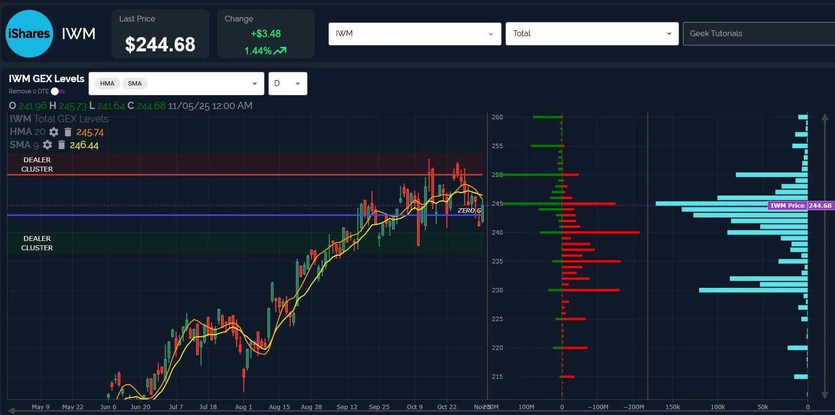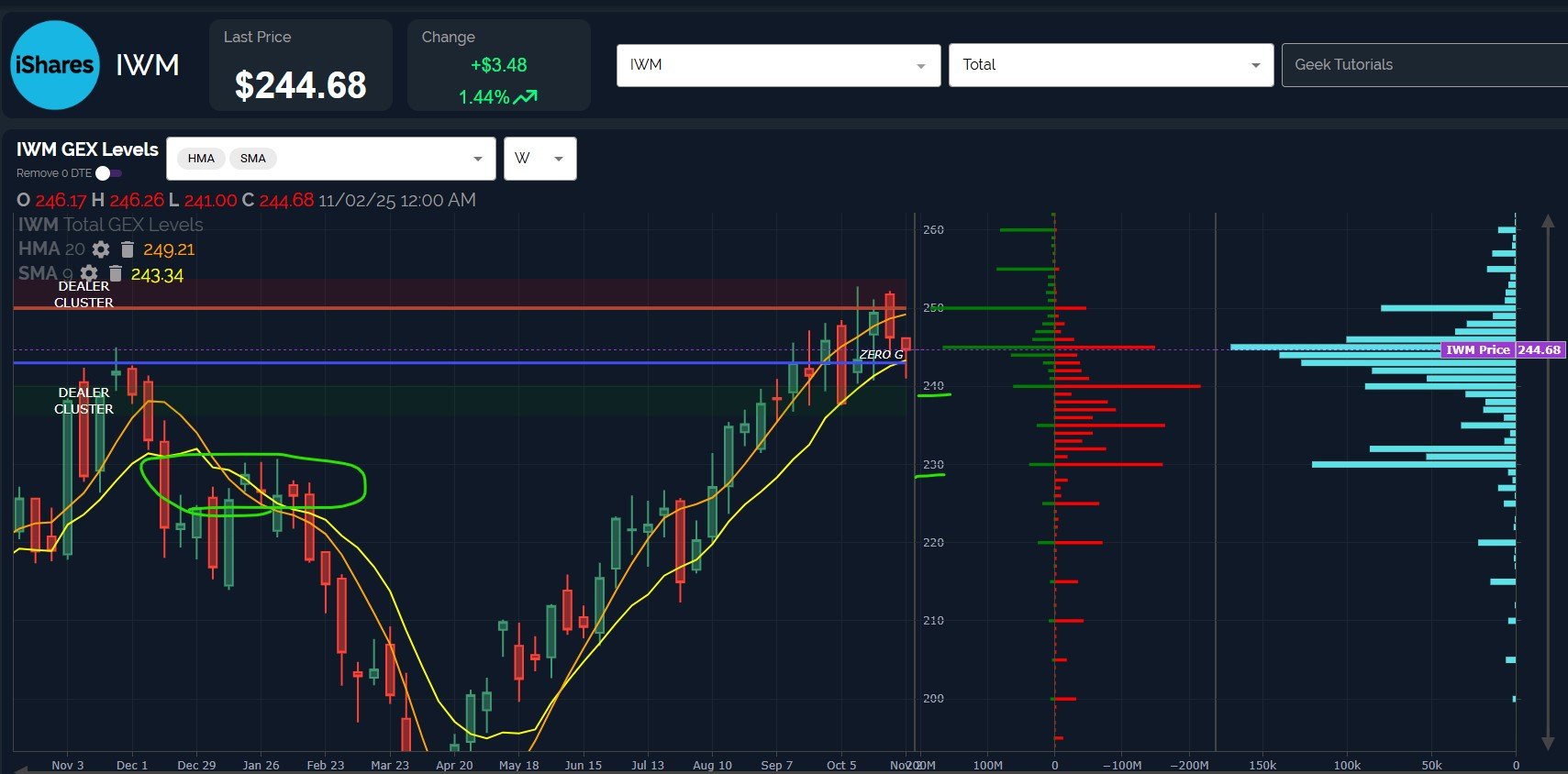 Interestingly, and possibly a feather in the cap of the bears, GEX for QQQ has shifted to reflect the largest GEX cluster at 610 expiring November 14, implying potential downside into next week, even if an intermittent bounce carries us slightly higher.
