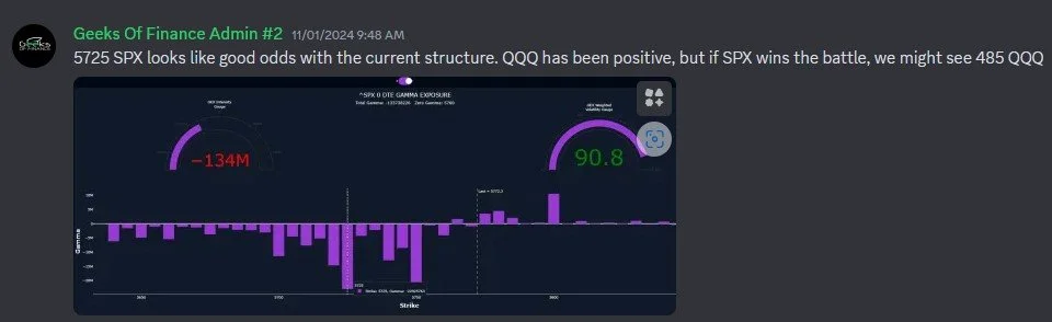 The low of the day for QQQ was 485.2, and SPX reached 5723. Smells like victory. Importantly, the GEX picture was quite contrary to early technical signs that may have excited some bulls into thinking “breakout!” At the end of the day, actual market positioning (our focus being GEX) is concrete data, but chart indicators are strictly theoretical. I always appreciate indicators confirming what I see with market positioning, but when the two collide, I will always choose positioning in terms of prioritization (though not exclusively).