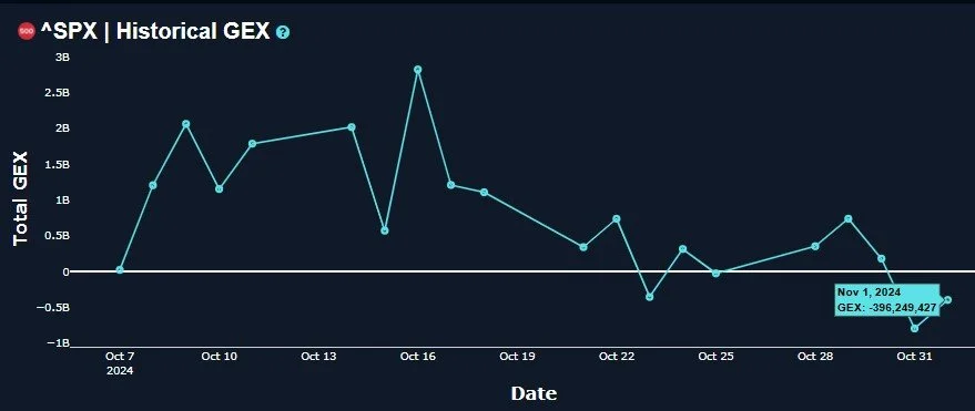 This week brings with it a number of market uncertainties, ranging from the reaction to the election,\ to PMI data to a Fed interest rate decision Thursday (delayed a day due to election results, apparently). Regardless of party, it would seem that certainty would be preferred to uncertainty, so a clear victor Tuesday night may result in a deflating of volatility as demonstrated by the VIX in similar past instances. This would mean the market can rise if we know who the President is by Tuesday night. Does this impact the Fed’s rate decision? In theory, it shouldn’t, so we’ll see if the reasoning given for their decision will be coherent or not before passing judgment. And the Fed’s decision can certainly add or detract from the starting direction on Tuesday/Wednesday. So there are plenty of reasons to watch GEX closely this week to improve your odds of being on the right side.
