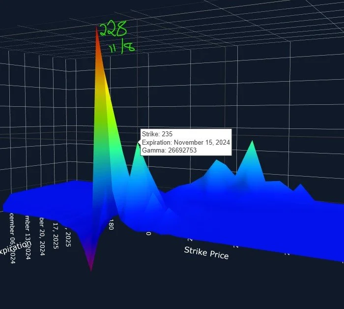 Today’s close at 227.48 makes sense in the context of the largest GEX cluster expiring tomorrow, which is at 228, but what caught my eye is the OpEx cluster at 235. I even see some interest at 240 (not highlighted below), and I think both of those are entirely possible by Friday 11/15.