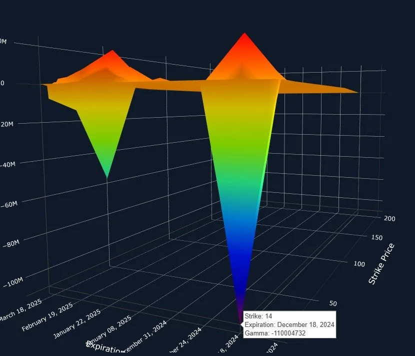 The VIX sees its monthly option expiration during OpEx week sometimes (such as December’s OpEx this year), and other times it falls on the week after. GEX has helped us with some parameters that proved to be fairly accurate in hindsight over the last few months, particularly since the VIX has been so lopsided toward negative GEX lately. Before we look at the GEX setup, let’s look at the chart below, which actually carries bullish potential for volatility: We’re at a longer term theoretical support area for the VIX, we’ve seen volatility subtly moving higher since the VIX regained the Hull 6 trading sessions ago, and we see signs of weakness from some indices. Seasonality would be an argument against the VIX, but will the market get droned this holiday season? We certainly see plenty of atypical things happening around the world.