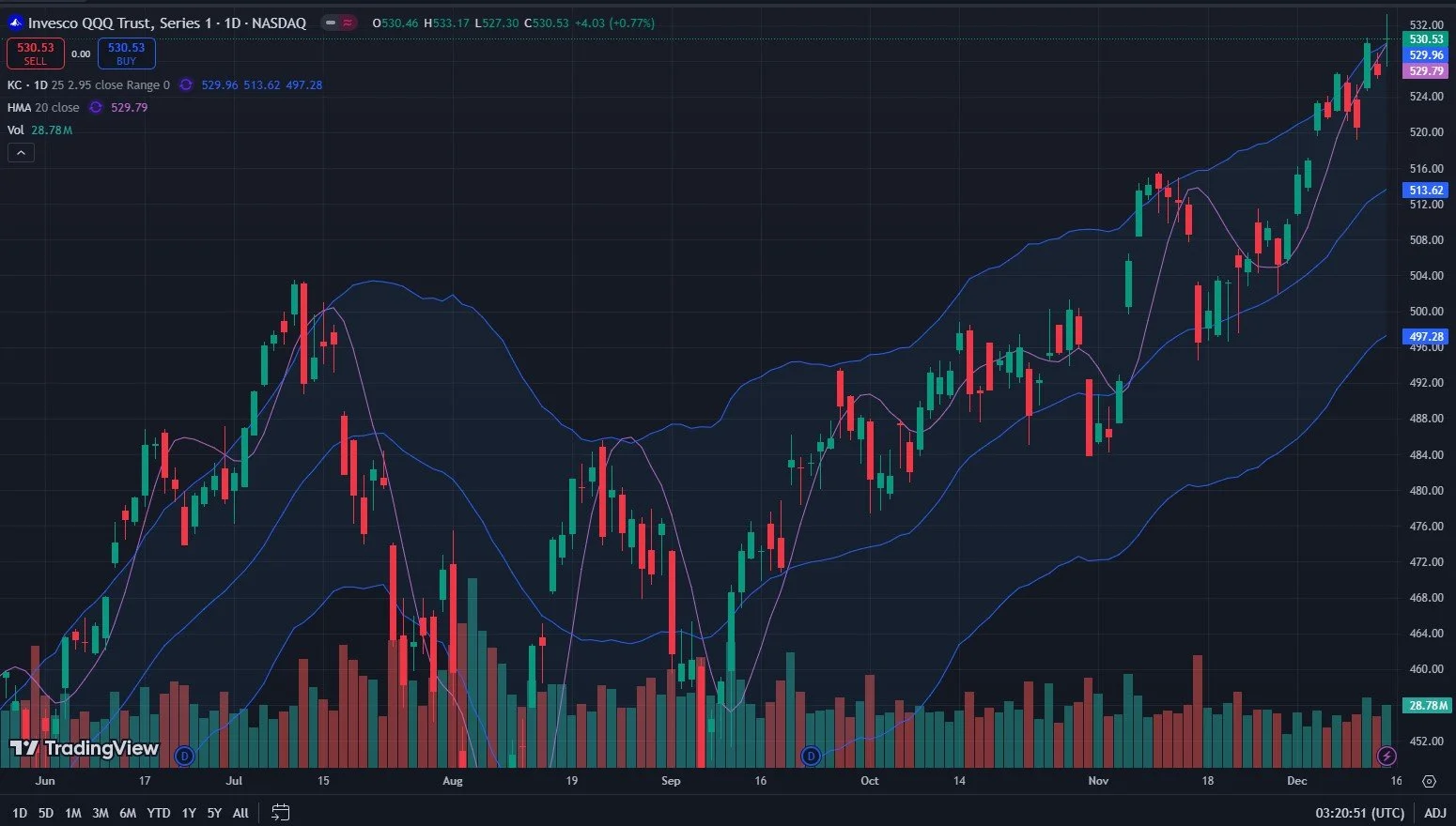 QQQ, in contrast to SPX, made a new all-time high Friday, what a spectacular showing. I will continue to point out that the extreme position above the upper Keltner, with the Hull beginning to overtake QQQ’s price, will be a headwind for QQQ and intraday fades like we saw Friday will not surprise me at all. I would prefer to see 500-513 revisited and then see what the total picture looks like. Friday’s potential reversal candle may also be a red flag. Or wait, a green flag..A green red flag. Yes, that’s it.