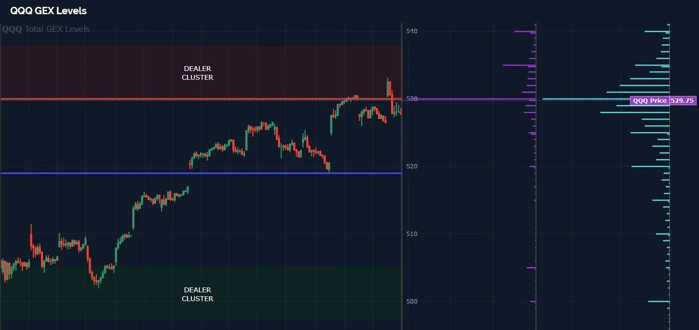QQQ GEX levels aren’t helping the bulls right now. We’re in a G1 Dealer Cluster, where dealers may end up becoming hate sellers, and so far, the box shows rejection (though no follow-through, obviously). We can always climb deeper into the box, but combined with technical factors, I don’t have a lot of confidence in that scenario, at least not without a pullback.