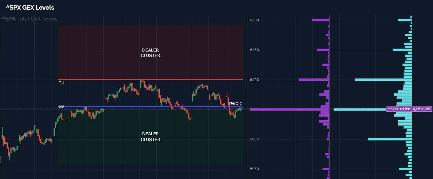 Despite the negativity, SPX is in the G2 Dealer Cluster where we may see an attempt to reverse the downward move, with 6100 as the primary initial target. We do see good volume at the 6100 strike Friday, as you see below.