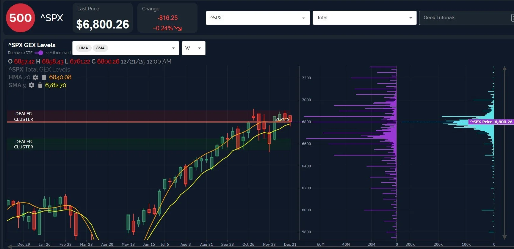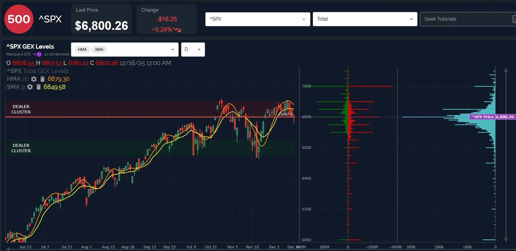 Let’s switch our chart candlestick timeframe to daily and the GEX shown back to the total (gross) GEX picture: You can see the significance of the big negative GEX (much of which is expiring Friday) offsetting the positive GEX at the 7000 strike.