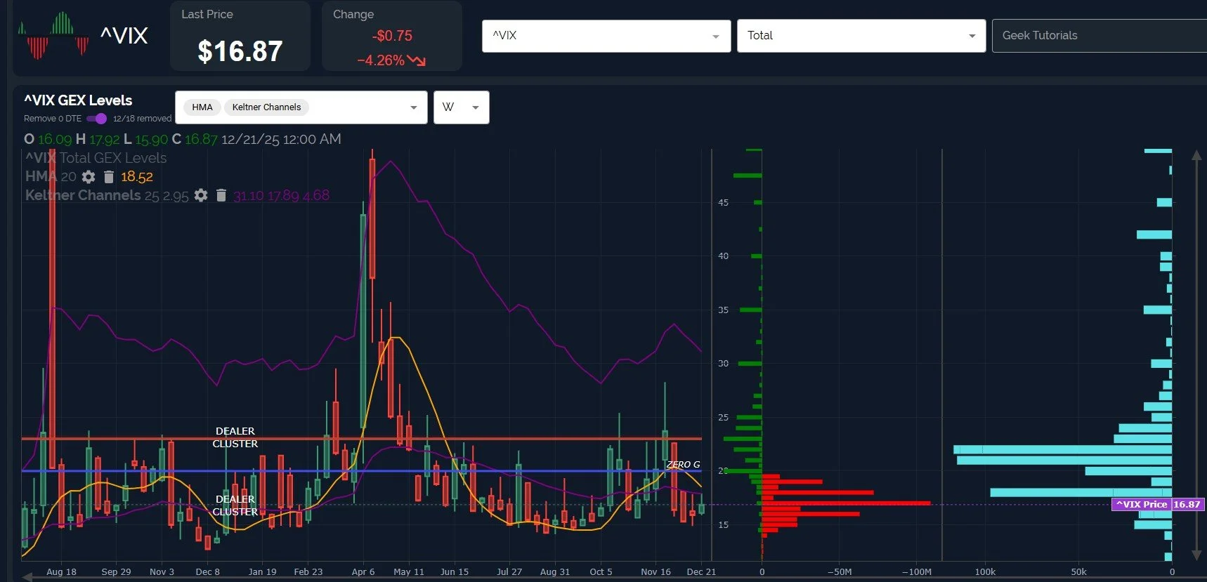 If we combine the weekly and daily charts, I think we can draw the following conclusion, at least the one that resonates the most with me personally: The daily chart is biased toward the VIX moving higher, but the arguably more important weekly timeframe suggests any near-term spike in the VIX may be rejected, whether that’s at the 18.52 Hull or as high as the zero gamma level at 20.