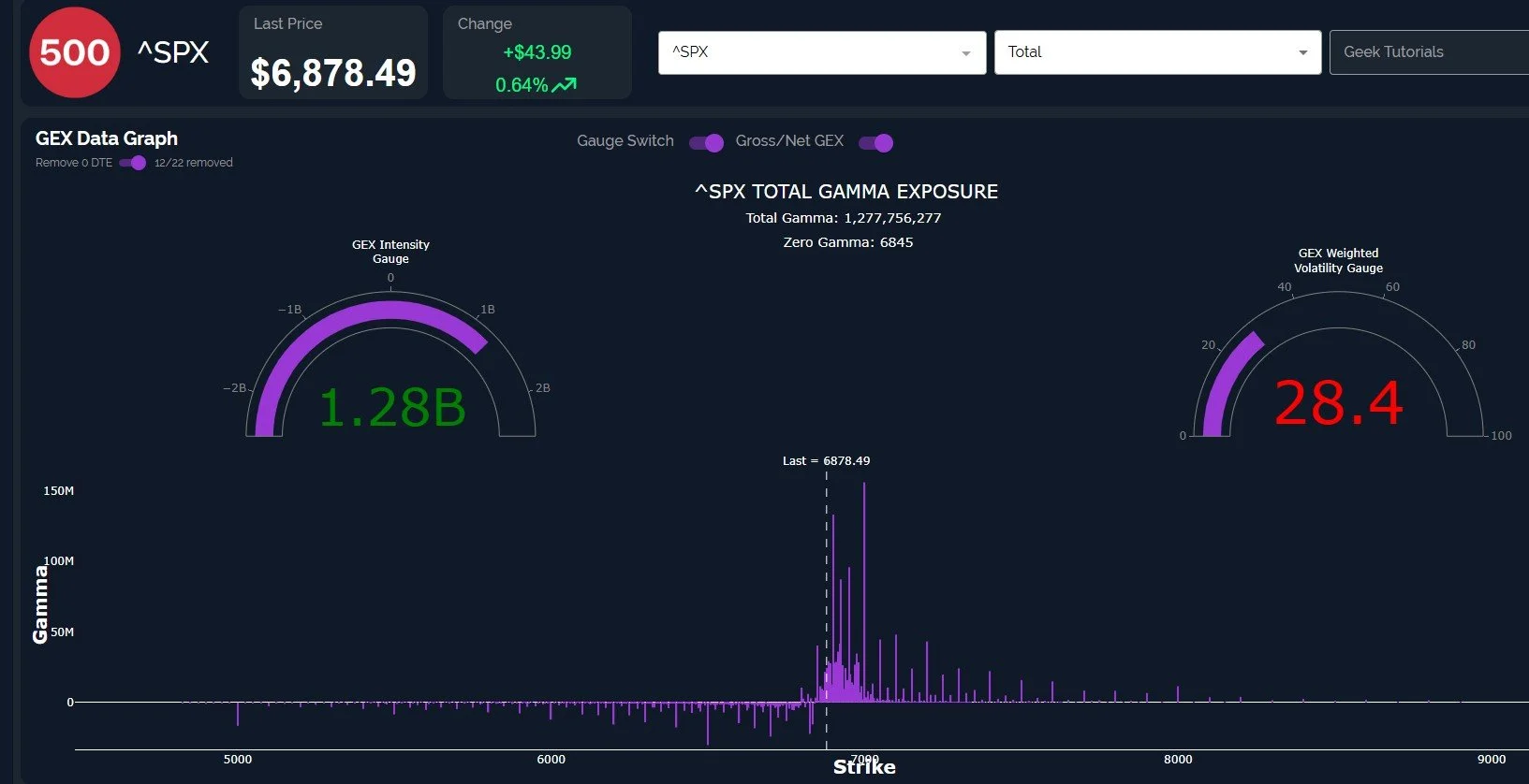 The SPX daily chart gives us a slightly different look at net absolute GEX at each strike, also allowing us to see those GEX clusters alongside the chart itself.