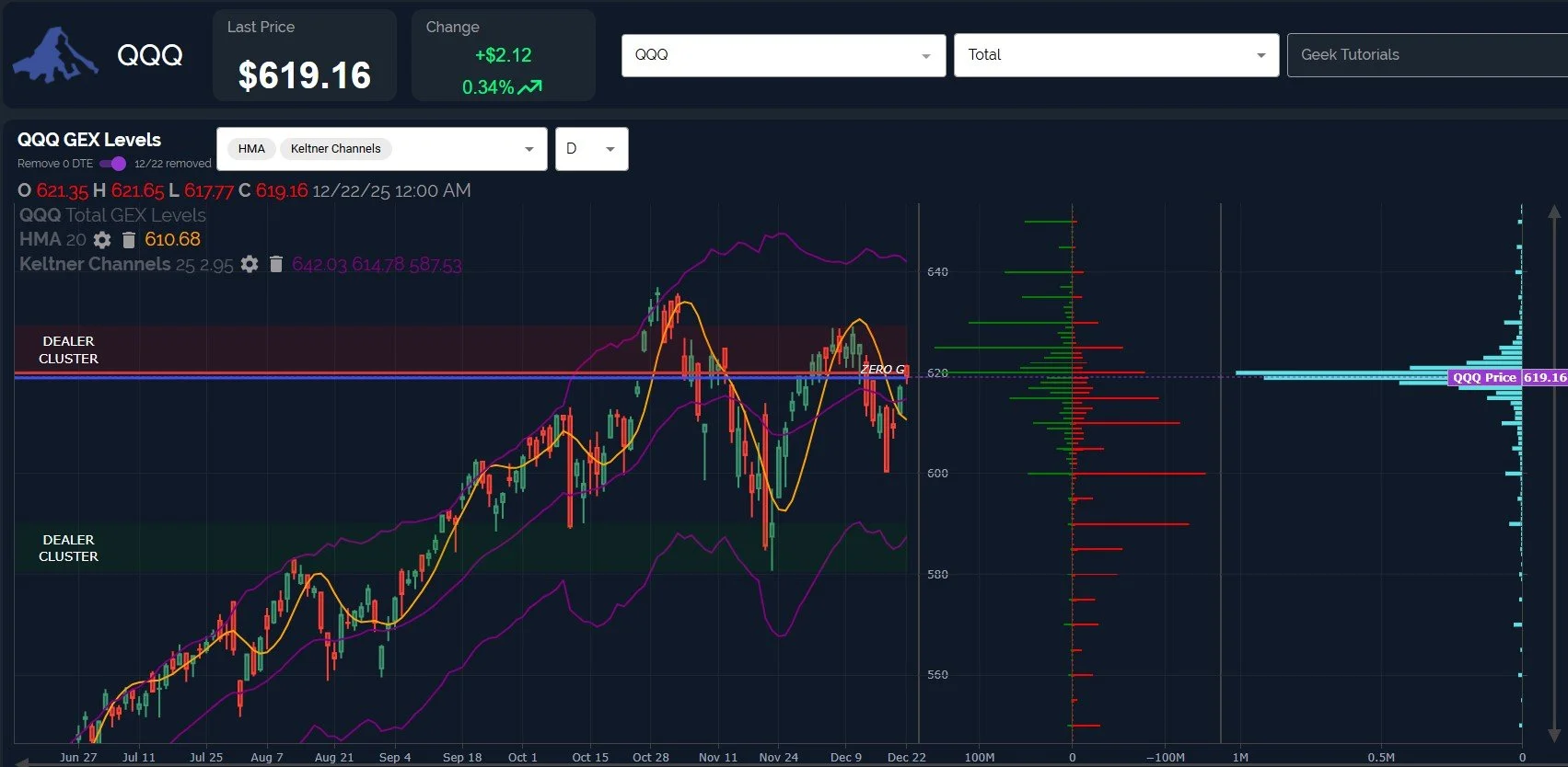 We see very nice confluence of the upper daily Keltner and the GEX at 7000, currently serving as a continued high-probability target into year-end (or possibly just into the new year).