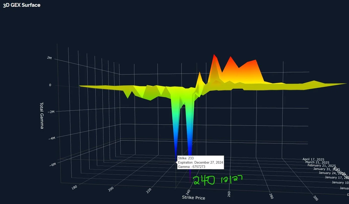 Lastly, the 3D graph is showing the largest clusters for this coming Friday (a shortened week for USA markets due to the Christmas holiday) at SMH 233 and 240. This negative GEX is below the current price for SMH and thus the 233 and 240 clusters reflect potential targets. Bulls are really going to want to see those positive strikes grow, or else 228 may actually be closer to reality than 260.