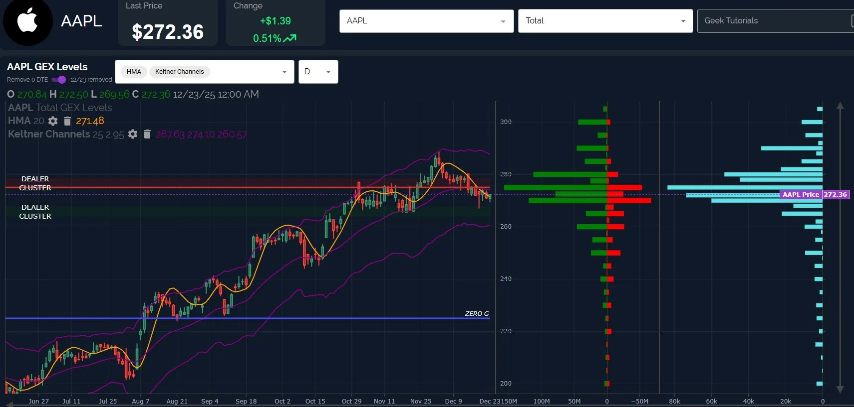 AAPL still shows net positive GEX and a strong uptrend since July.