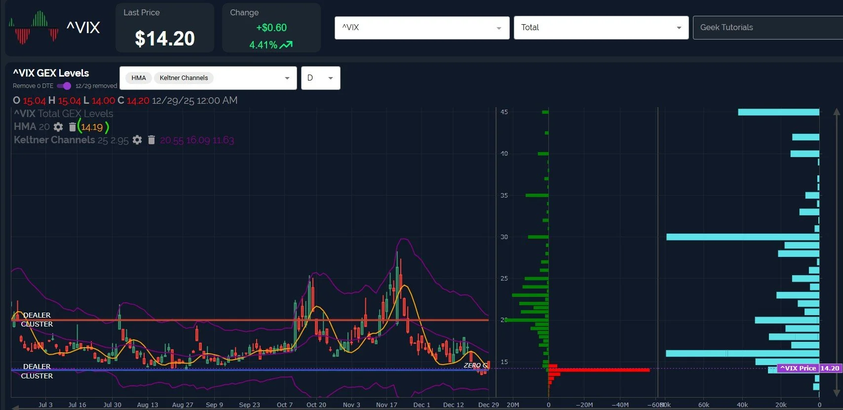 I think another concern I have (other than the VIX showing positive GEX, a lack of meaningful GEX below 14, and closing above the Hull) is that SPX wasn’t able to rally despite the VIX crush from 15 back to 14.20, which I personally (and speculatively) interpret to say the VIX is edging closer yet again to a point where it may exert itself to the upside.