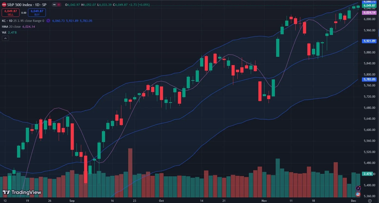 Let’s dig a little deeper into SPX’s 3D graph found on our website: While 6100 is the largest GEX cluster for Friday, the biggest GEX cluster on the map other than the 0 DTE options that have already expired is at 6050 for December 31. The highlighted clusters at 6150 and 6200 are actually concentrated on December 20. If this structure holds, we could end up seeing a market top by the 20th and then a drop into the 31st, though we’re going to have to reserve any actual conclusions until we see more data. The Keltners at 6060 not quite matching the GEX target of 6100 implies we might need more time (Friday?) to allow the Keltners to reach that 6100.