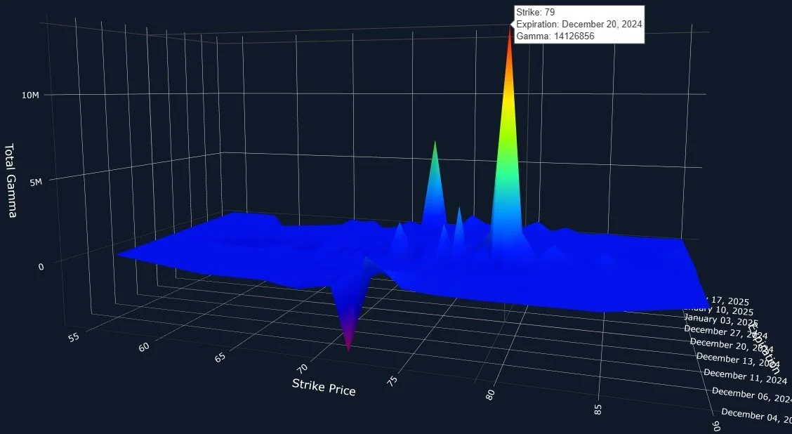 We don’t see a lot of GEX clusters visible on USO, but of those we see, 79 on December 20 is the most prominent. Maybe this long-running sideways consolidation is about to end?