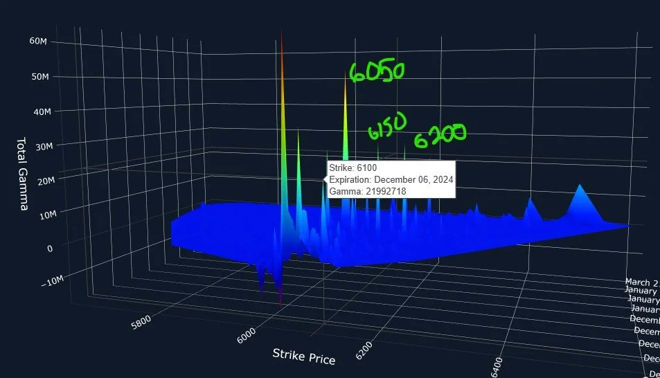 We’ll take a closer look, but a cursory glance at the levels shows that GEX levels continue moving up, with 6100 currently the largest positive cluster. We even see growing GEX at 6200. Seems crazy, right?